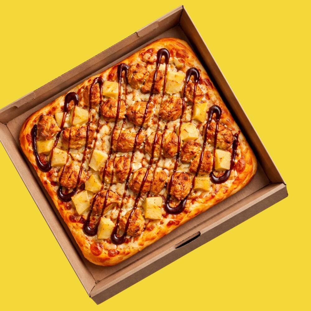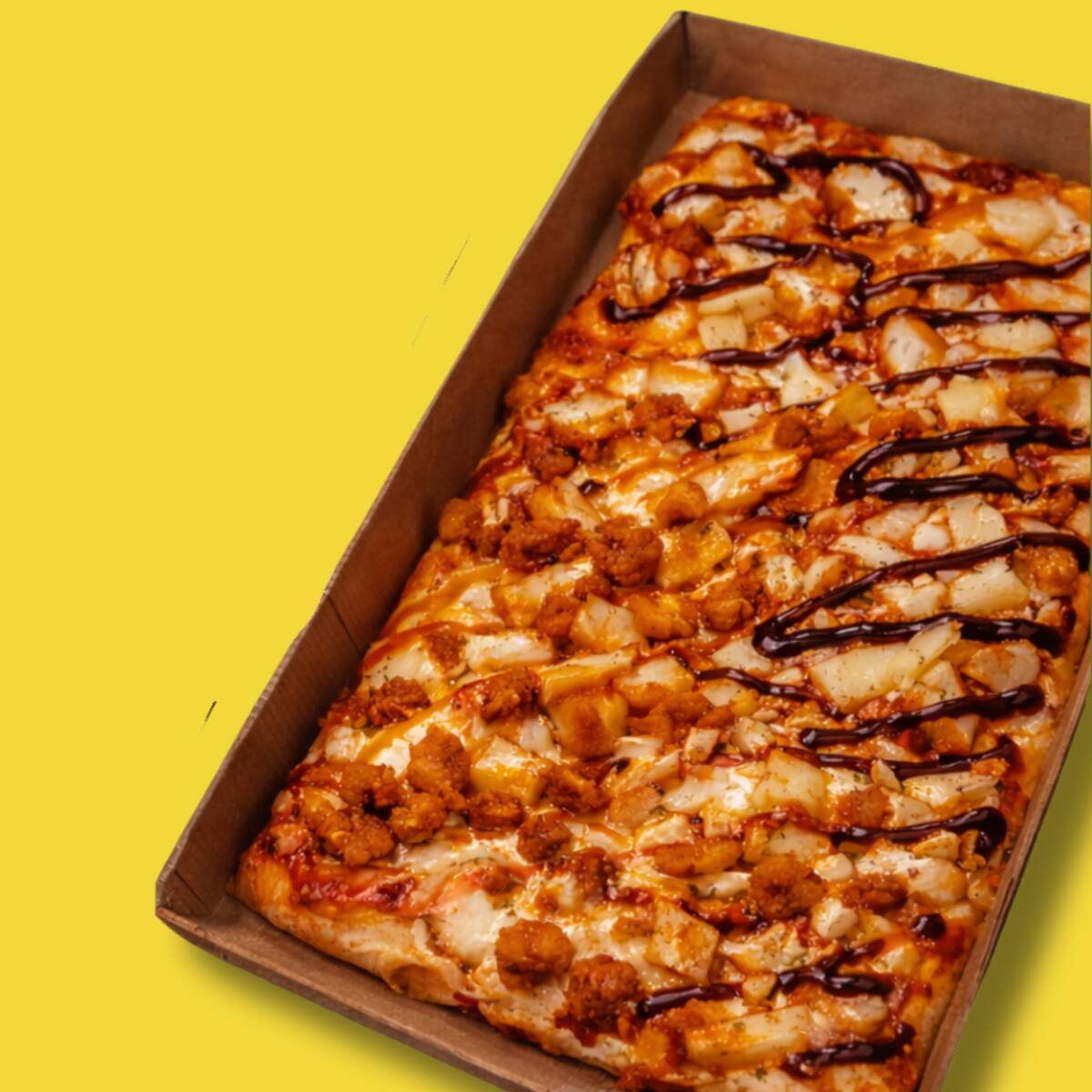 "Pizza con boneless, piña y tu salsa favorita. 6 rebanadas llenas de queso fundido, cubiertas con boneless jugosos, piña dulce, y bañadas en la salsa que elijas. Una combinación intensa y deliciosa que se vuelve adictiva. (Porción: 6 rebanadas + 2 salsas + 1 dip de ranch)"