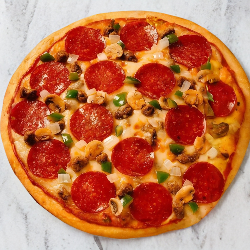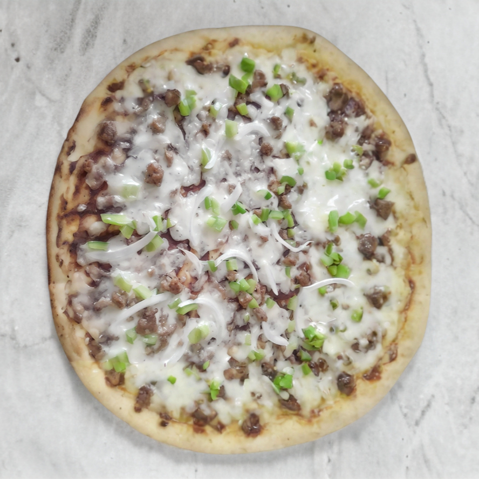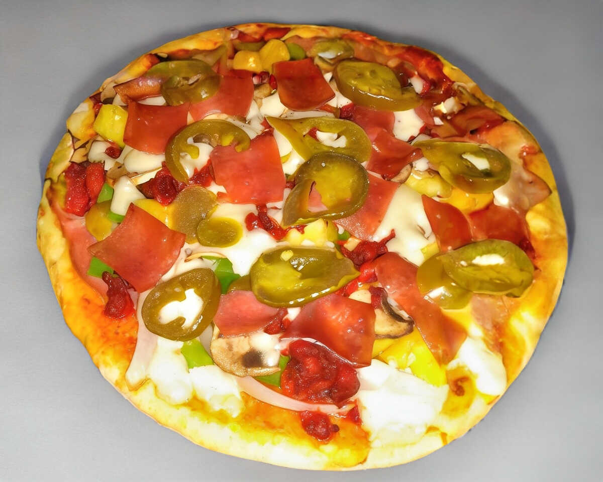 Masa delgada, Jamon, Chorizo, Champiñones Frescos, Cebolla, Piña y Bolitas de Philadelphia.