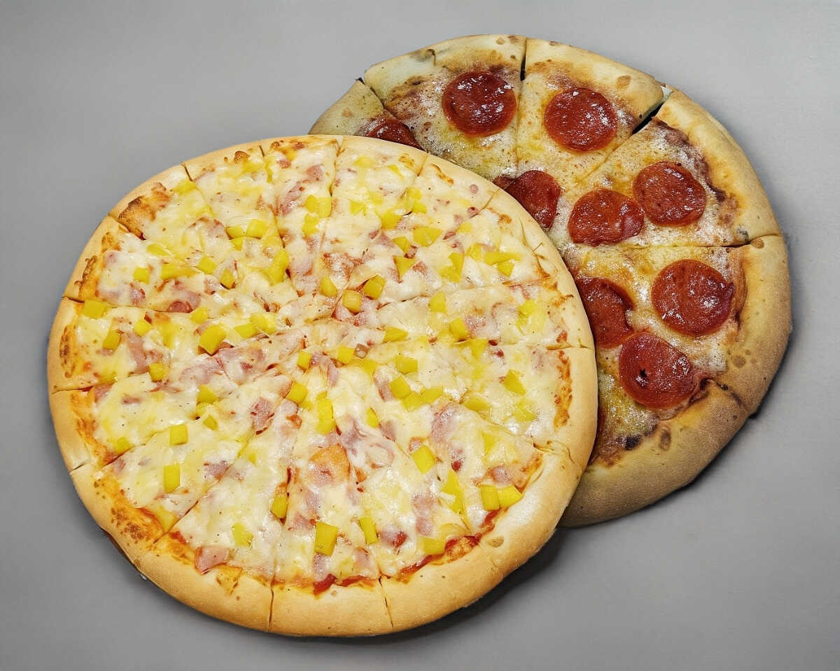 2 PIZZAS GRANDES 10 REBANADAS C/U HAWAIANA Y PEPERONI