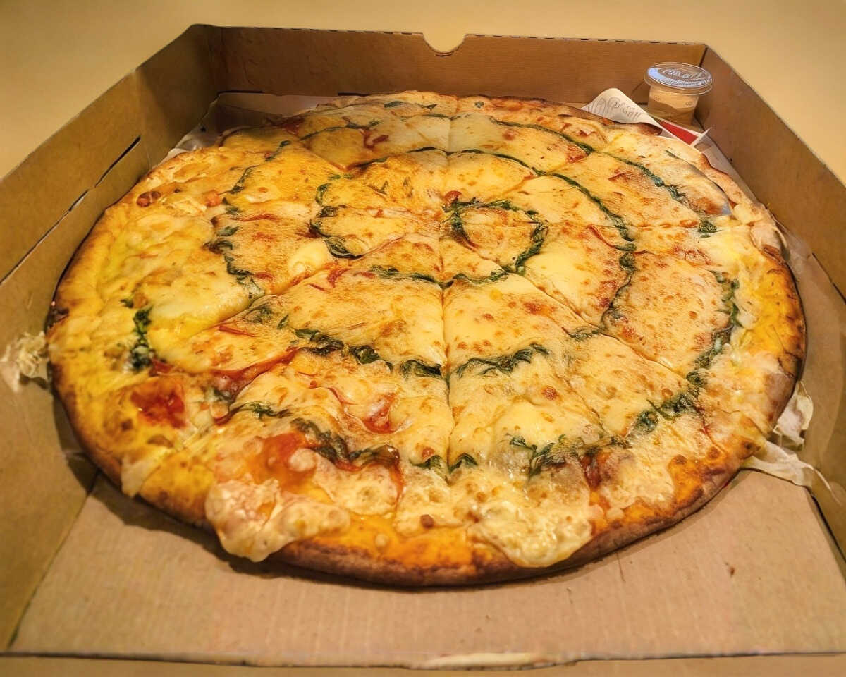 Salsa de tomate,queso mozzarella,queso gouda,camarones bañados ligeramente en ajo y parmesano.