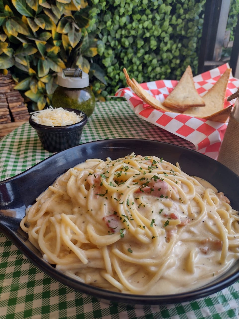 Tocino ahumado,con un toque de vino blanco,salsa blanca de la casa,parmesano,acompañada de mini bollos.