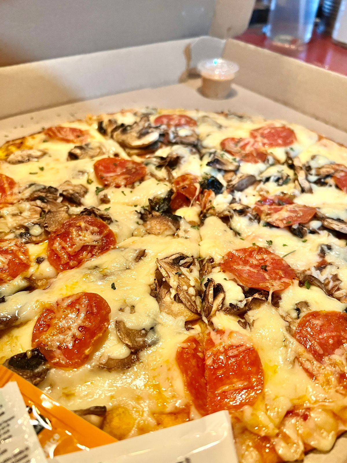 Salsa de tomate,queso mozzarella, champiñones frescos,peperoni,un toque de parmesano