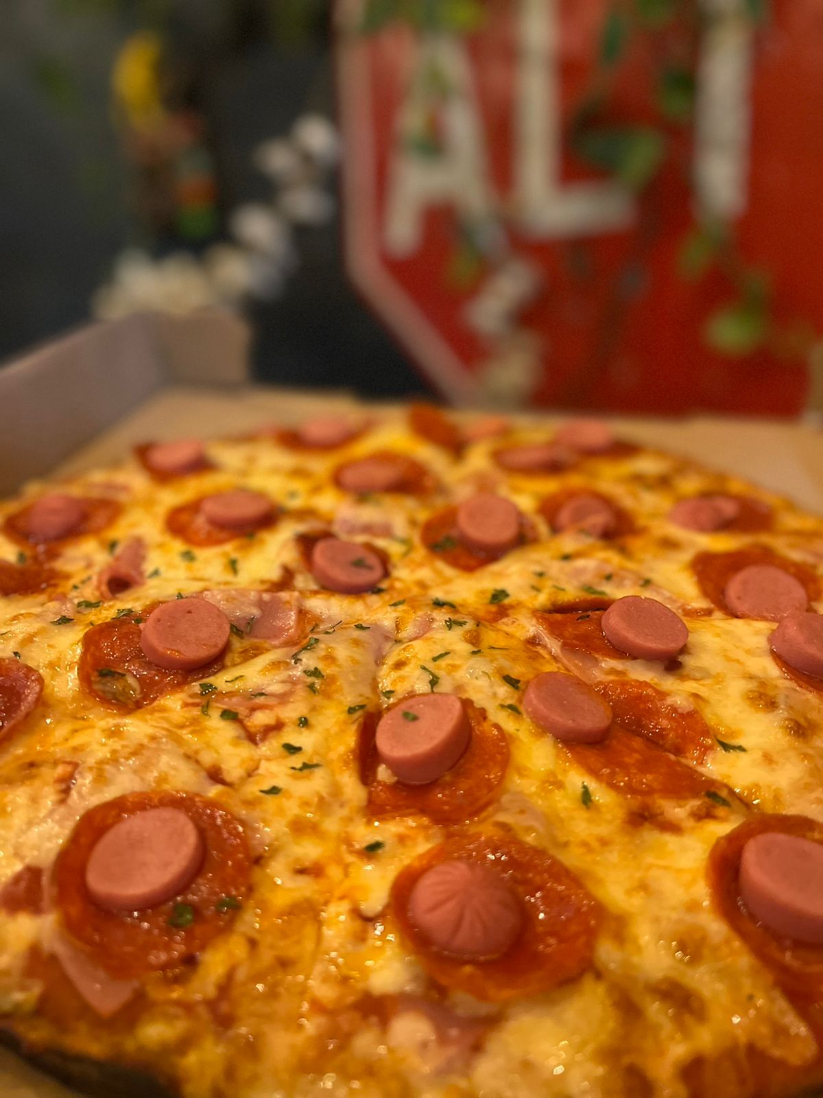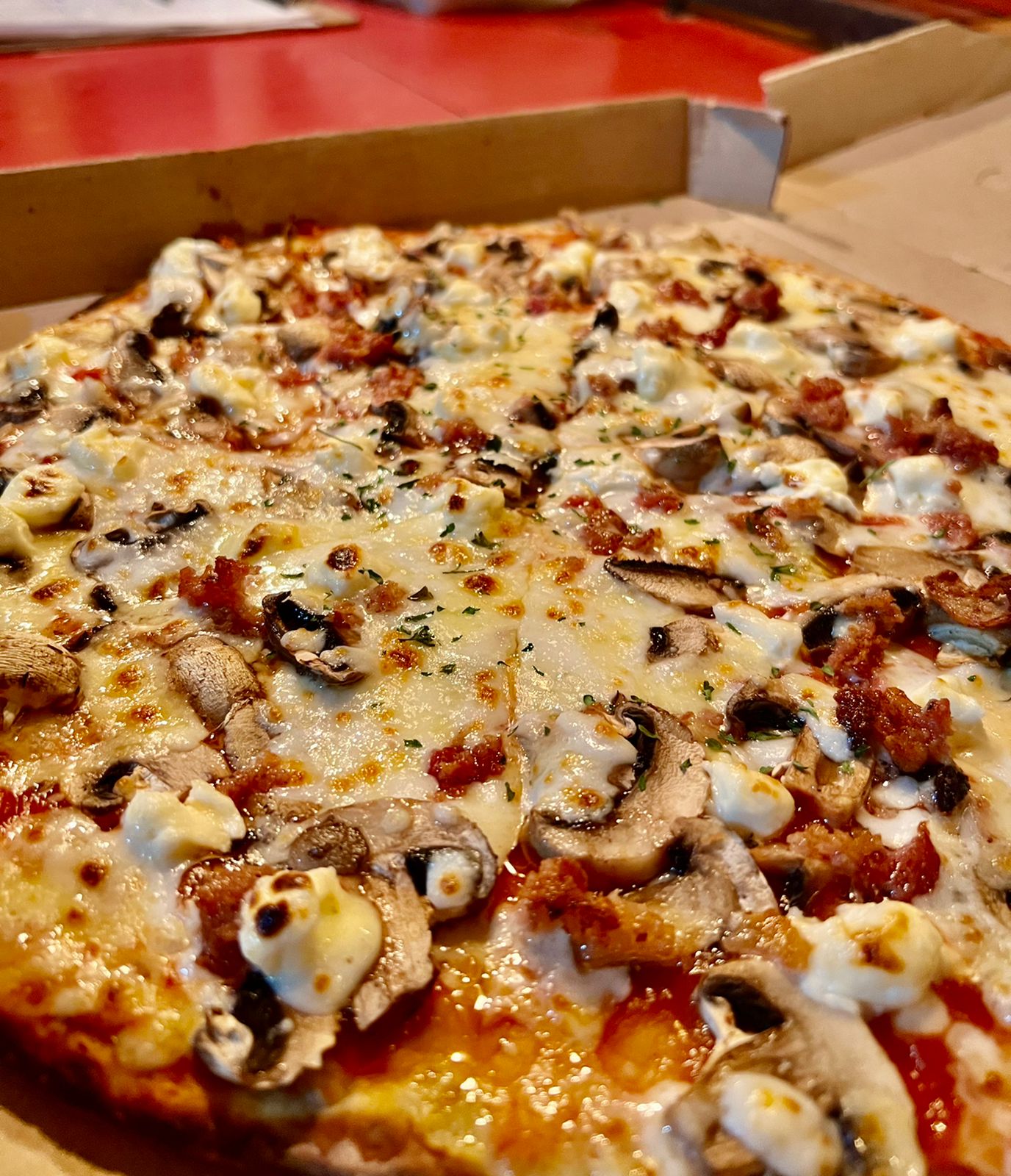 Salsa de tomate,queso mozzarella,queso gouda, champiñones frescos,tocino ahumado,bolitas de piladelphia