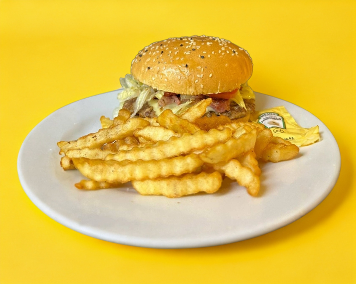Carne de res casera, queso gouda, champiñones, tocino ahumado lechuga y jitomate