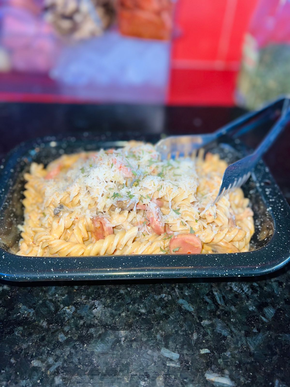 Jitomate en cubos,Jamon de pavo,piña en trozos,salsa de tomate,pasta fusilio,y parmesano..