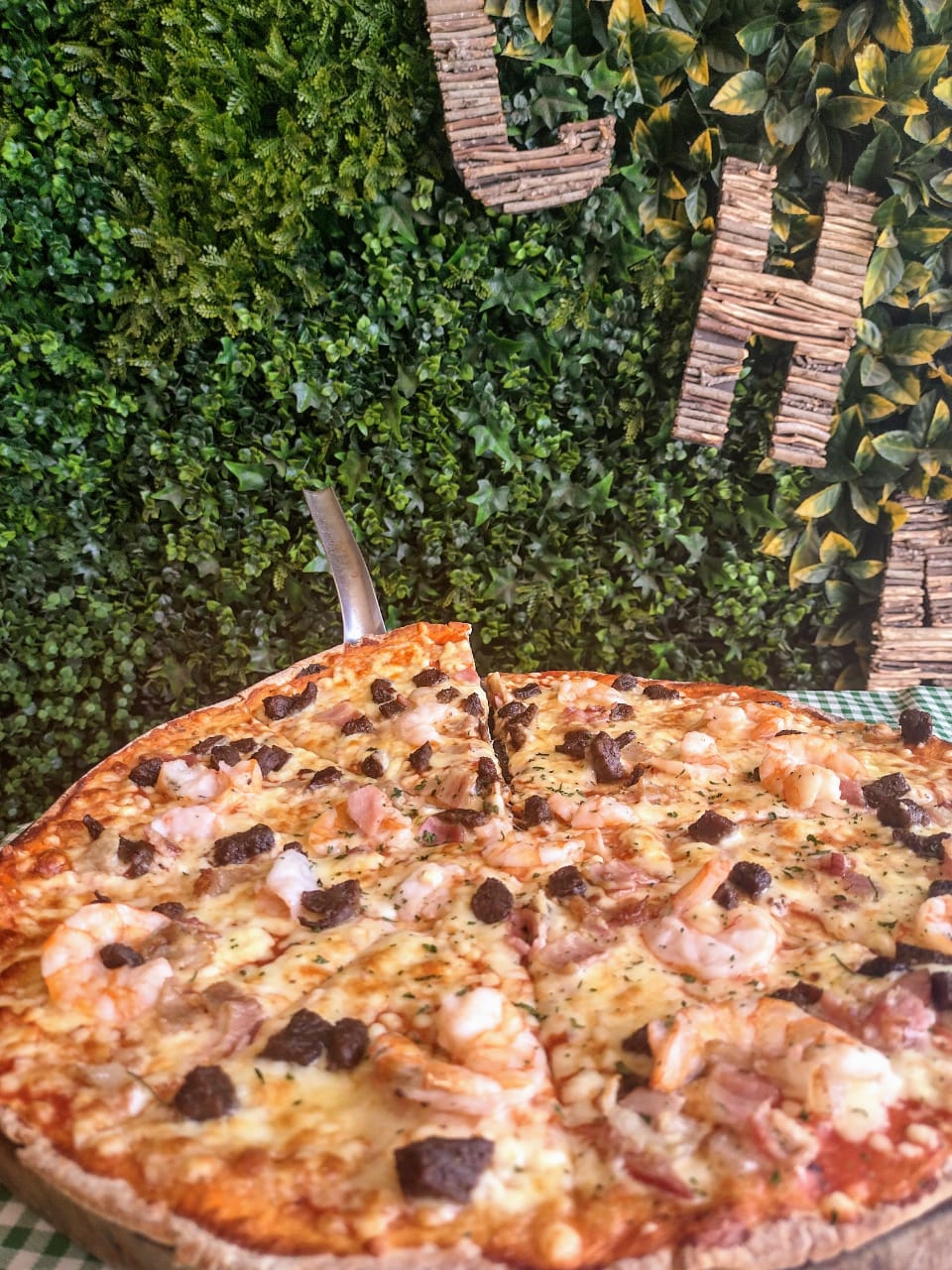 Salsa de tomate,queso mozzarella,queso gouda,camarones,bañados en pesto de cliantro.