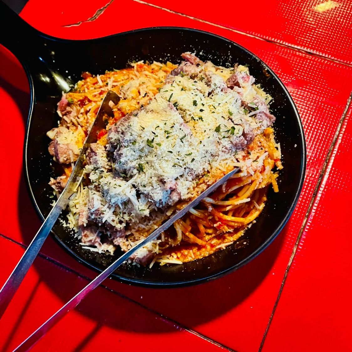 Clasica receta y renovada salsa boloñesa,parmesano,acompañada de mini bollos.