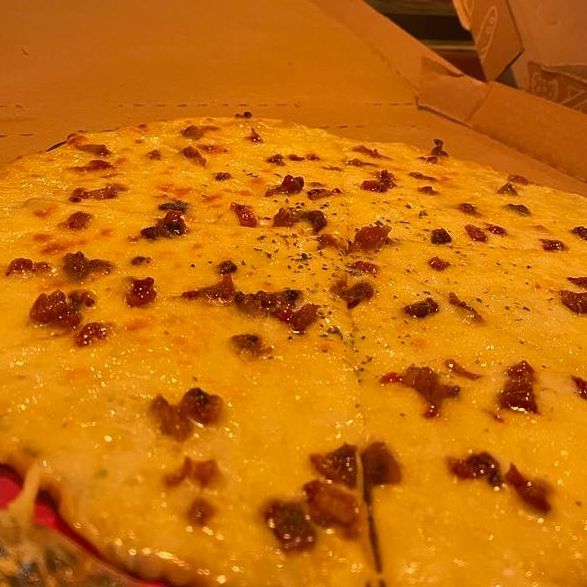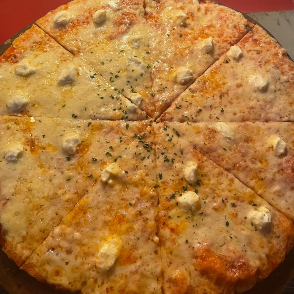 Tocino ahumado,pollo en cubos,arrachera en cubos,salsa blanca base de 4 quesos(parmesano,mozzarella,piladelphia,gouda).