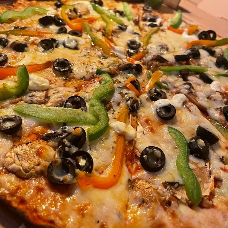 Salsa de tomate,queso mozzarella, champiñones frescos,aceitunas negras,pimientos,bolitas de queso cabra.