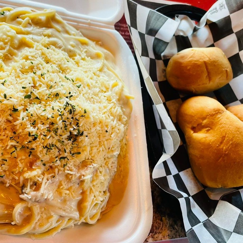 tocino ahumado,champiñones frescos,camarones,un toque de vino blanco,salsa blanca de la casa,parmesano,acompañada de mini bollos.