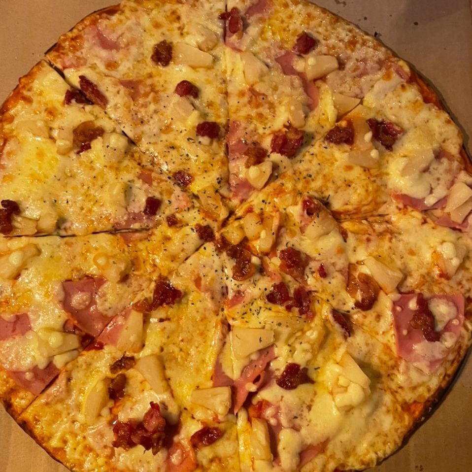 Salsa de tomate,queso mozzarella,queso gouda,tocino ahumado, trocitos de piñaa