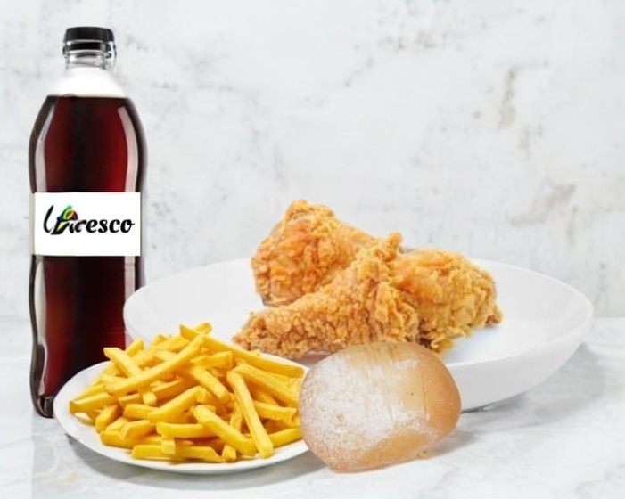 Incluye medio Kl de delicioso pollo empanizado frito,2 complementos chicos, 2 bebidas de 400 ml refrescos CH, 2 bollos de pan, 2 salsas BBQ, salsa mango con abanero, salsa picante.