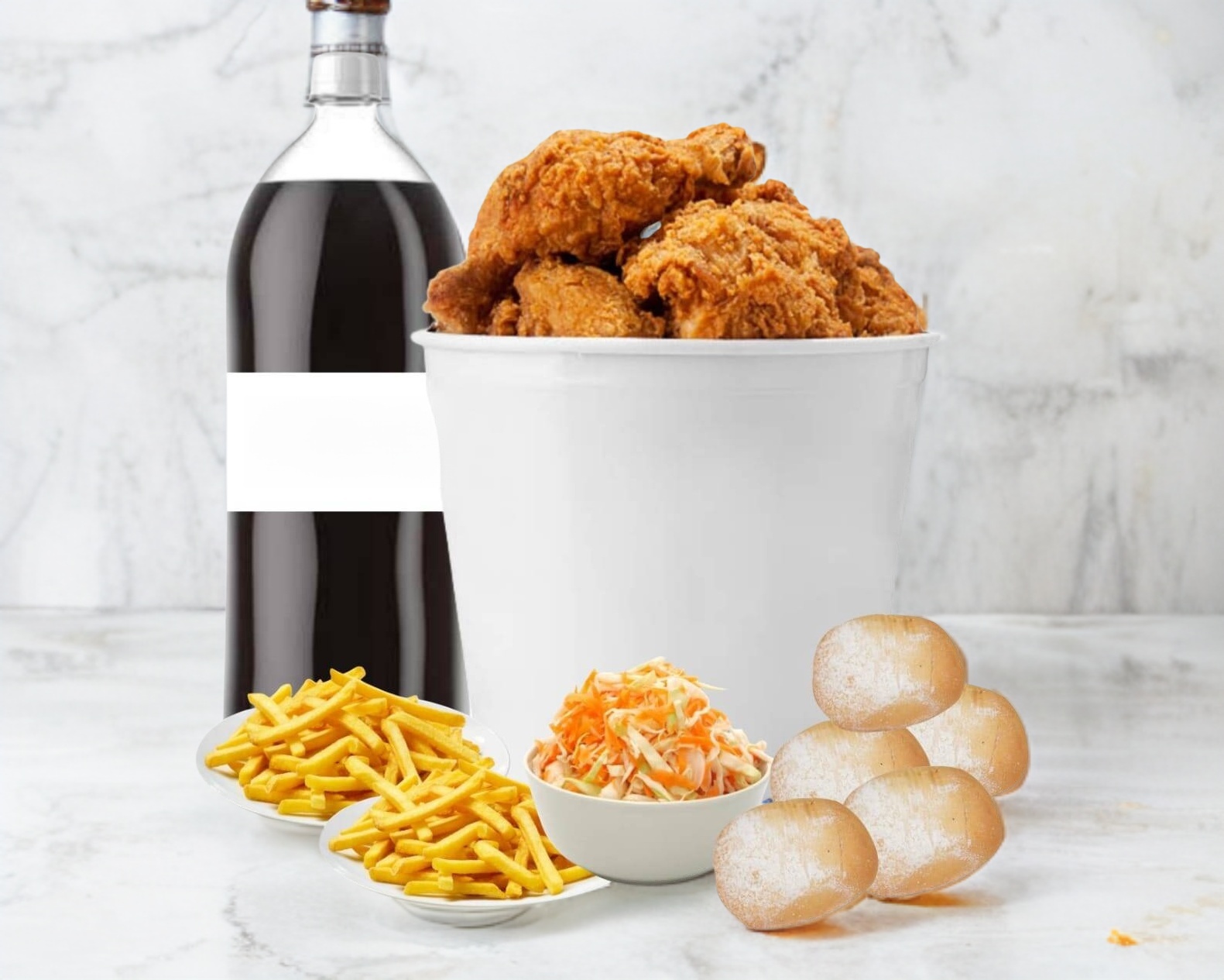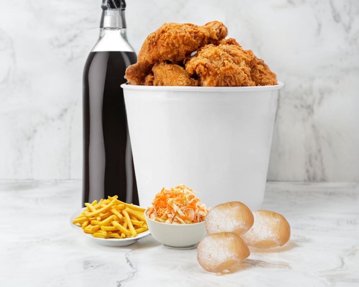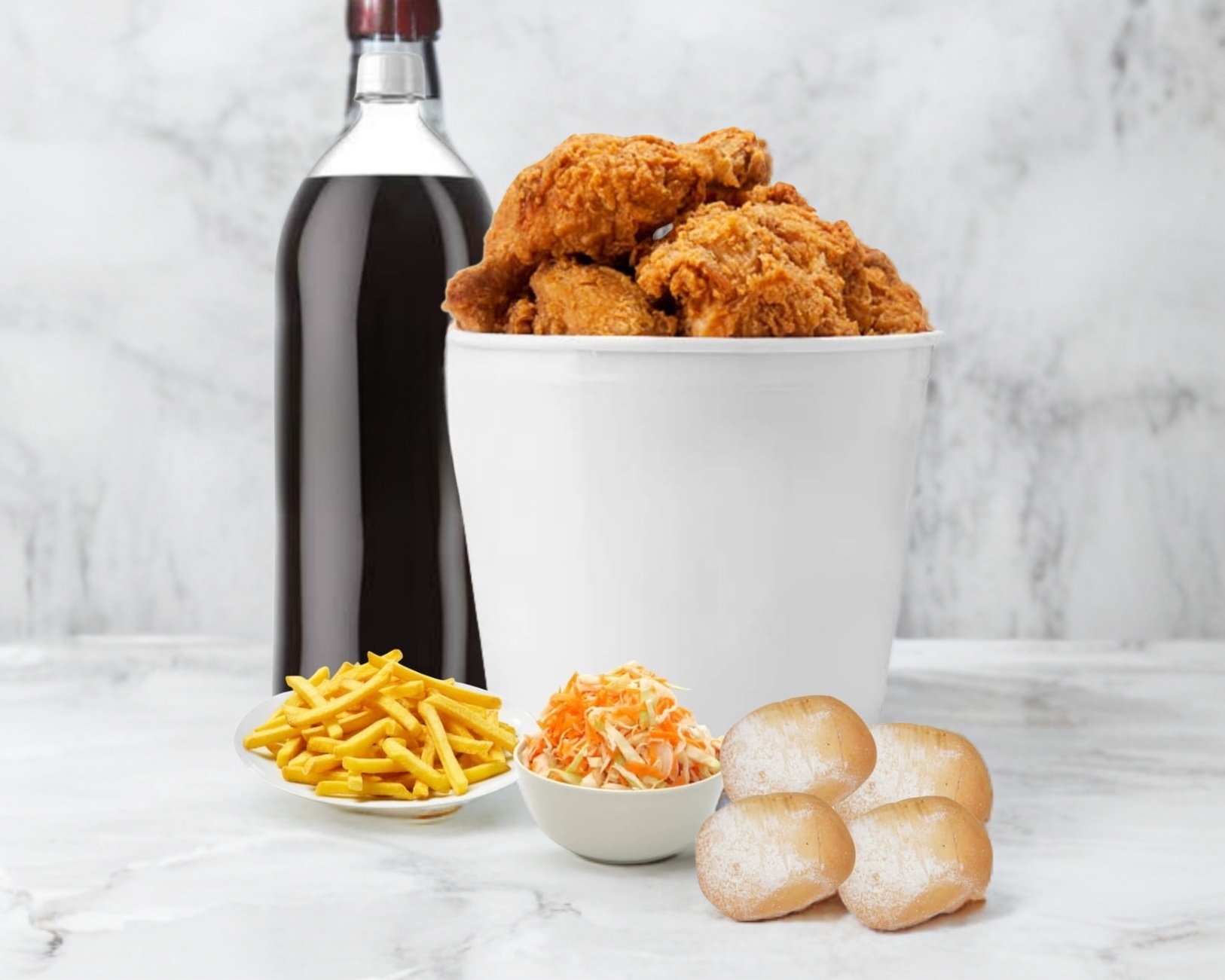 Incluye 2 KG de delicioso pollo empanizado, 1 refresco familiar, 2 complementos grandes, 5 bollos, 5 salsas.