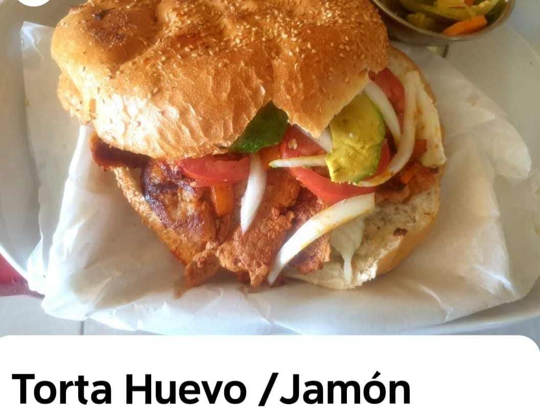 Torta de pan grande con jamón con huevo frijol, mayonesa, lechuga, jitomate y cebolla.