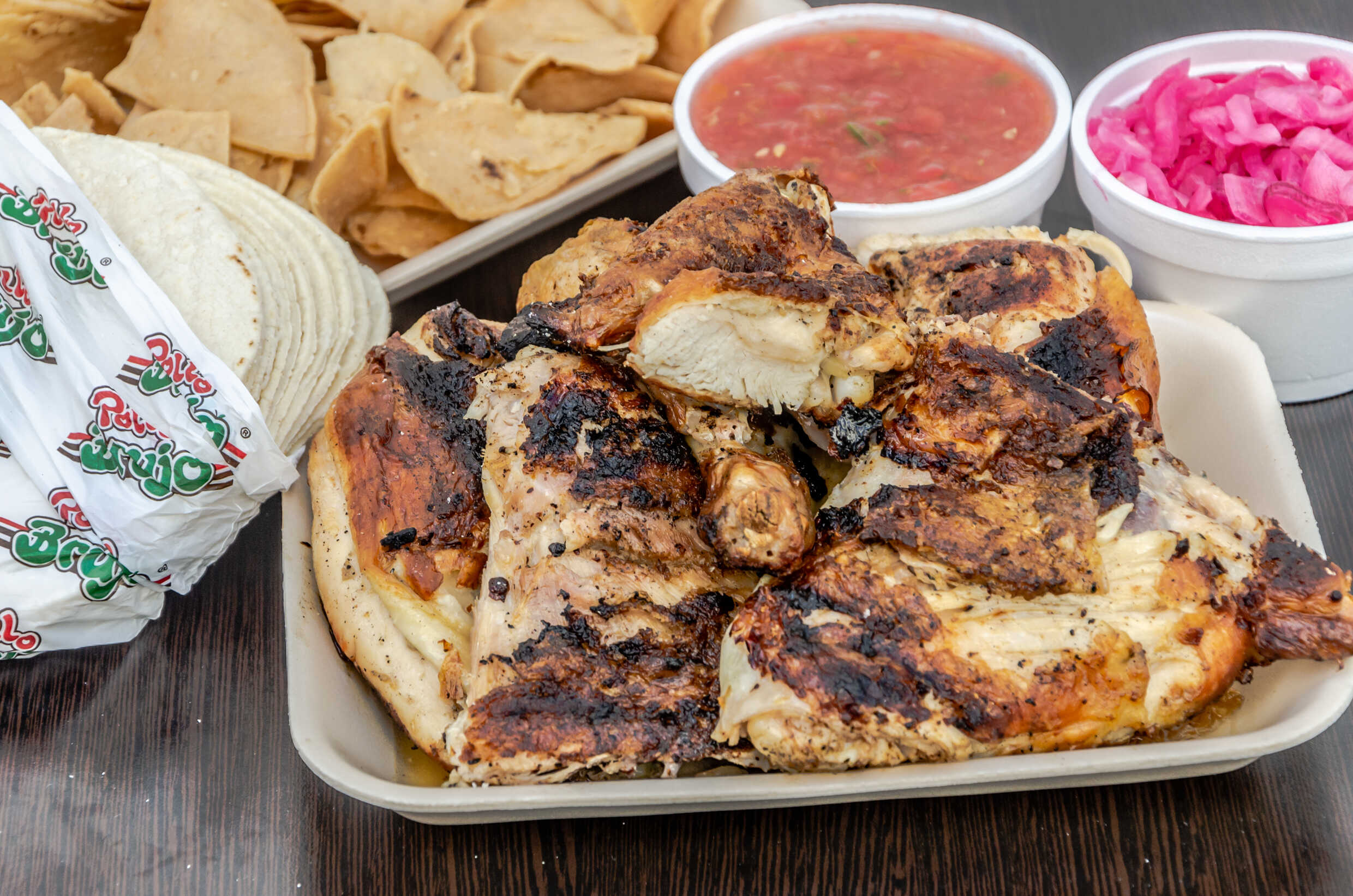 2 Piezas de Pollo (pechuga o pierna), tortillas, salsa, totopos y cebolla morada.