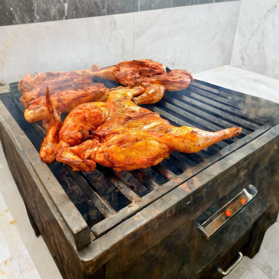 pollo asado al carbon , marinado casero ,jugoso , acompañados de arroz, frijoles, salsa, ensalada de cool, y tortillas