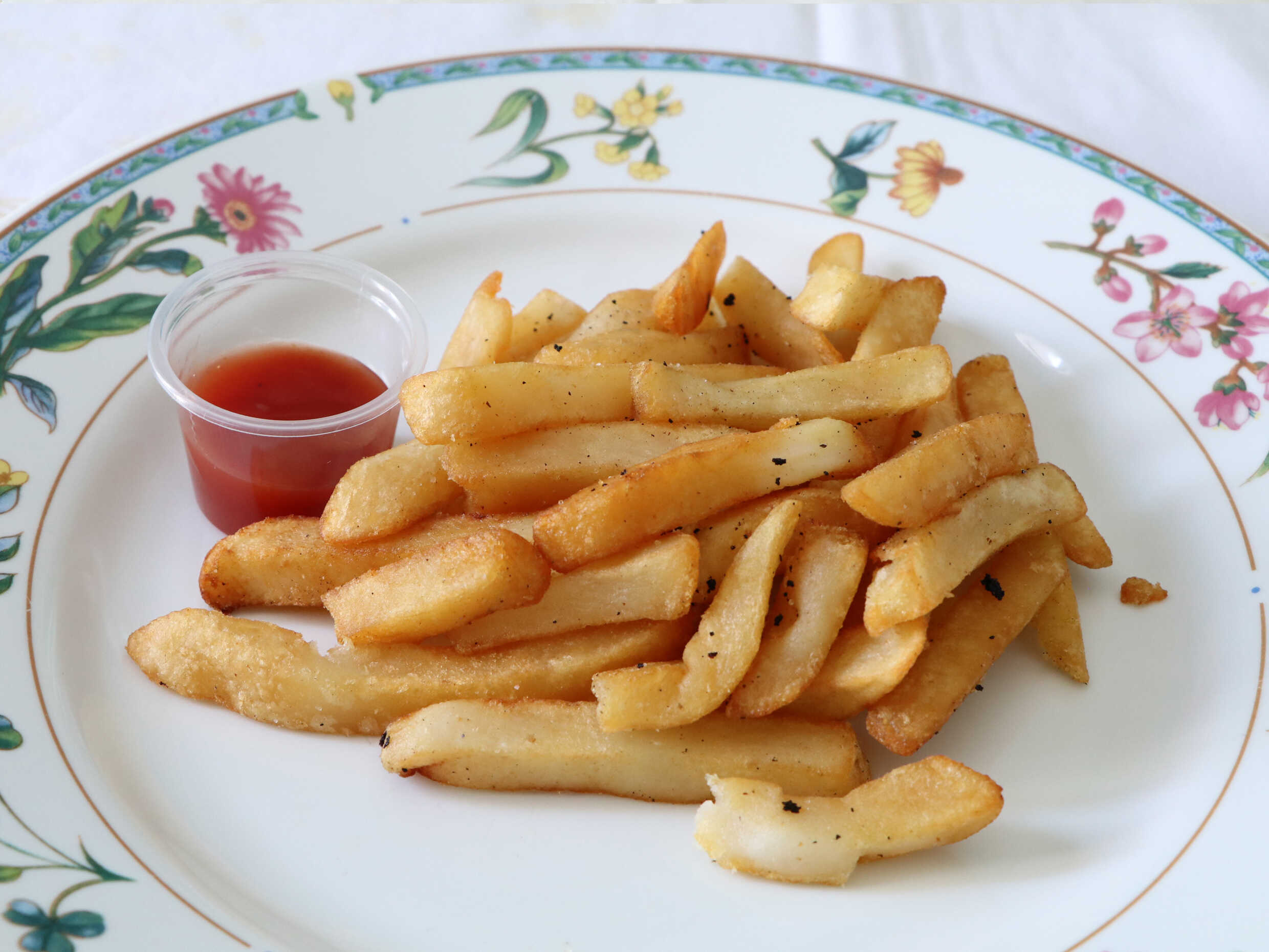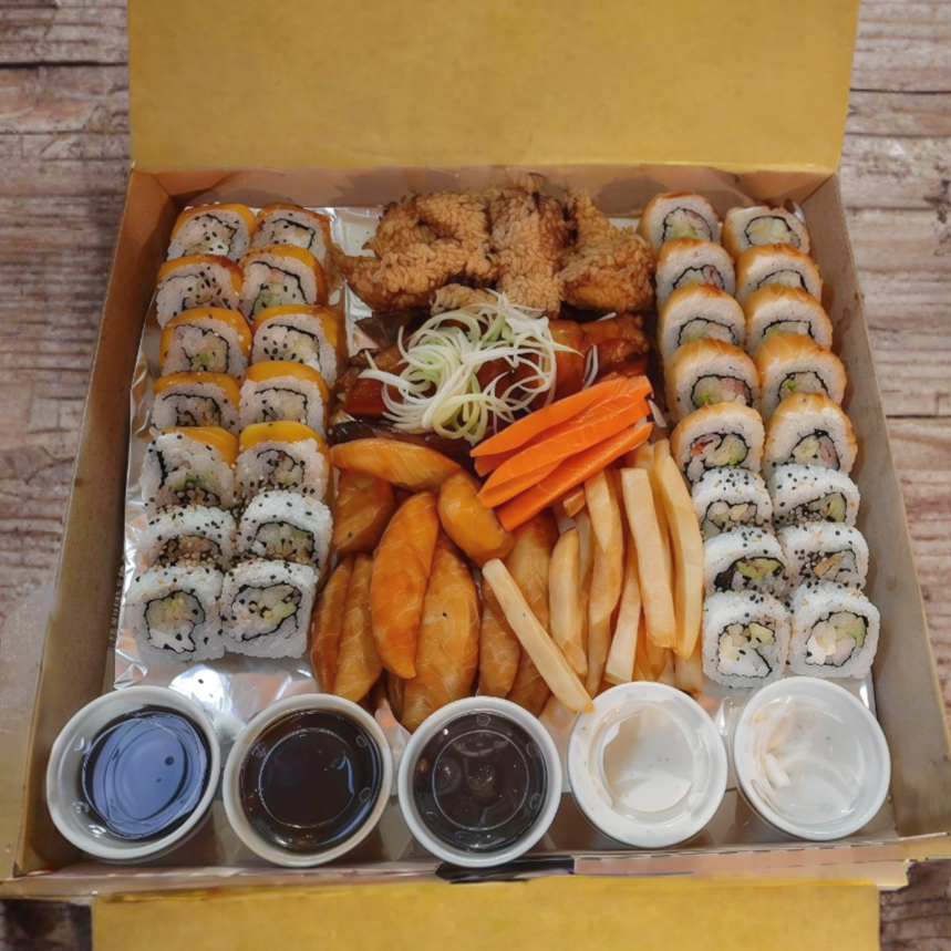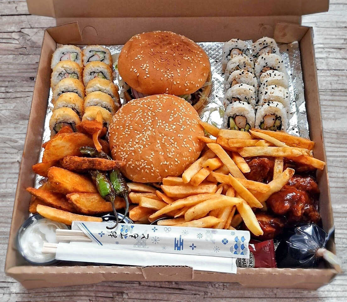 2 Piezas de sushi y 2 hamburguesas, 5 alitas (dependiendo la disponibilidad), 1 orden mixta de papas a la francesa y gajos.