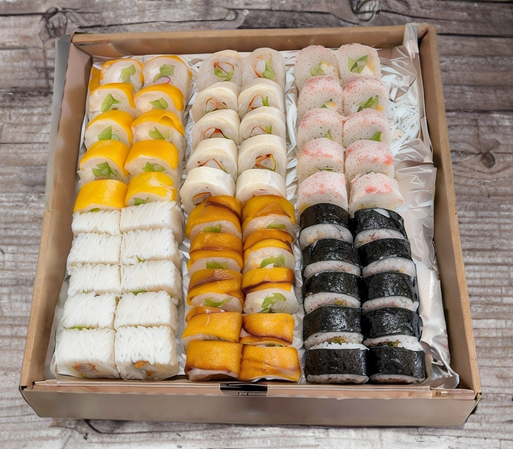 60 Piezas de ricos sushis naturales de camarón y surimi.