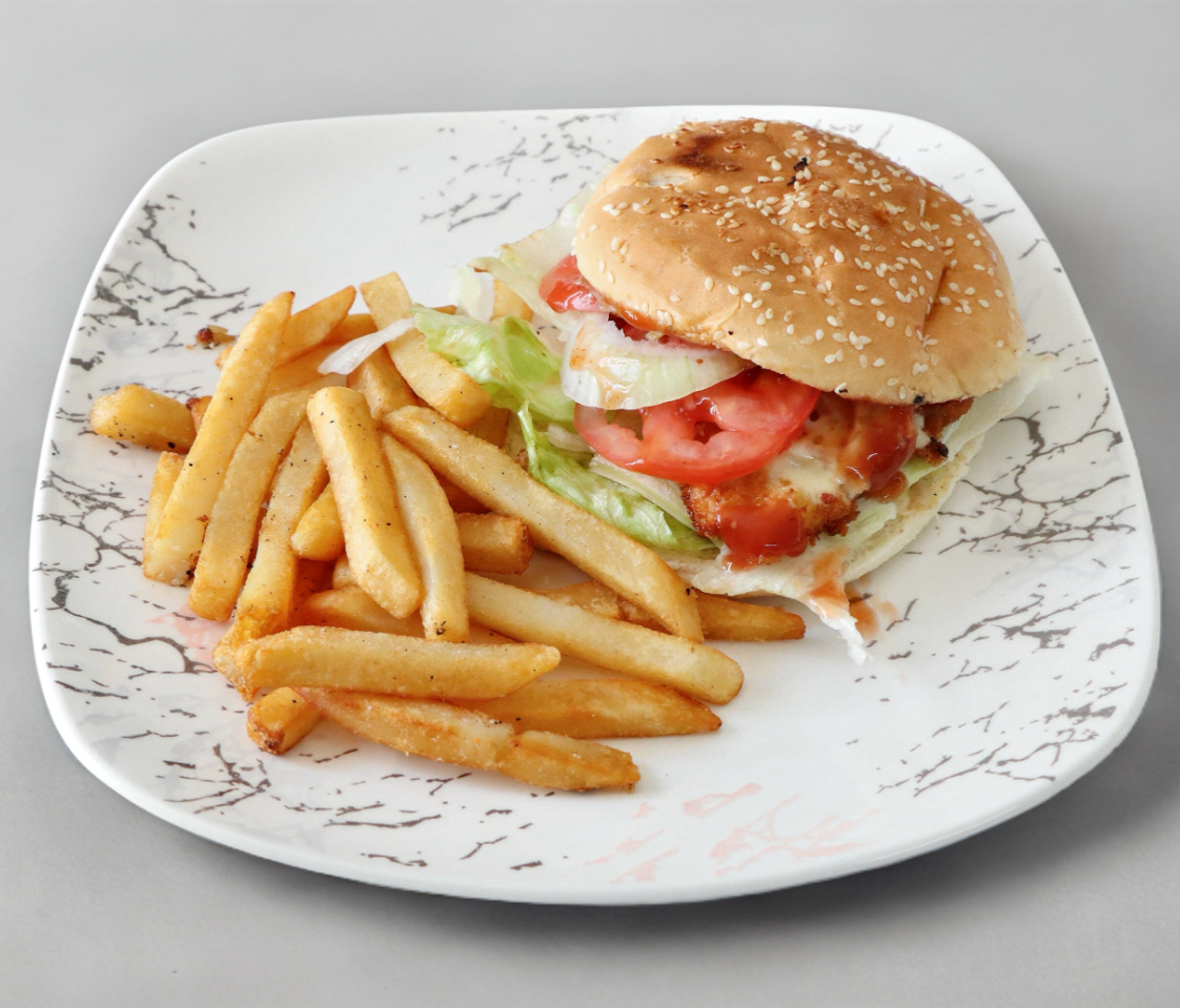 Milanesa de pollo empanizada, queso manchego, tomate, cebolla y lechuga, búfalo y ranch. Incluye papas.