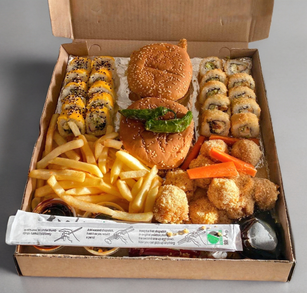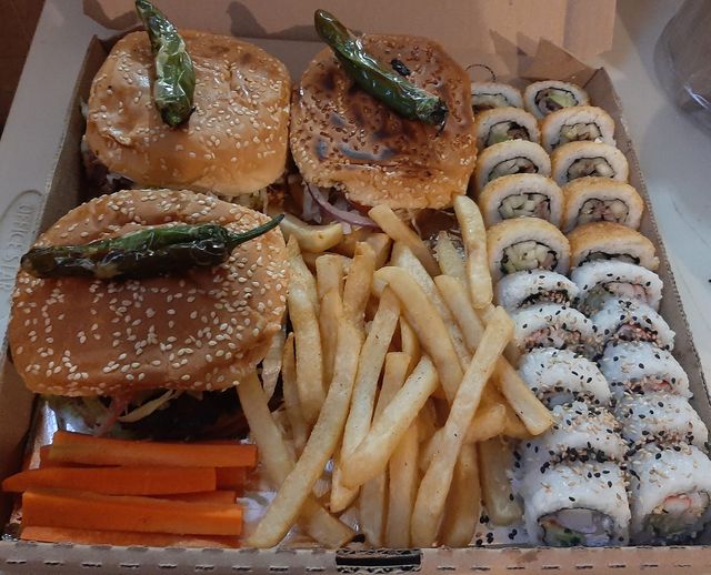 1 Hamburguesa clásica, 1 hamburguesa hawaiana, 1 hamburguesa crispy, 2 piezas de sushi a elegir, papas a la francesa.