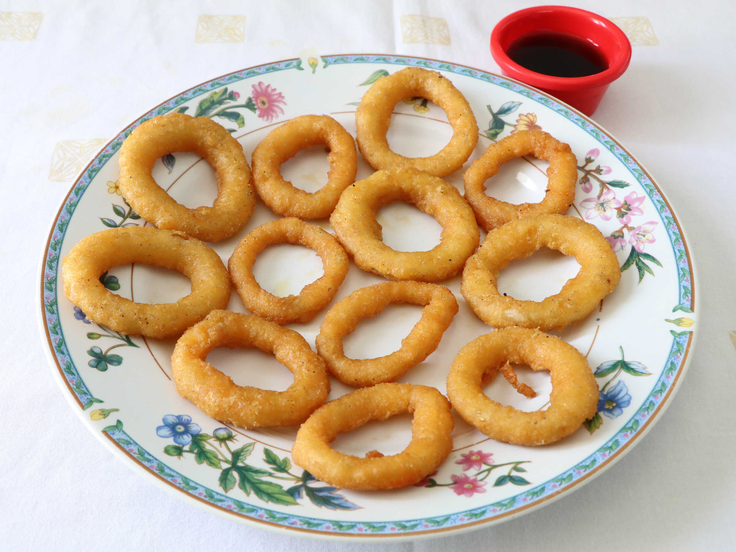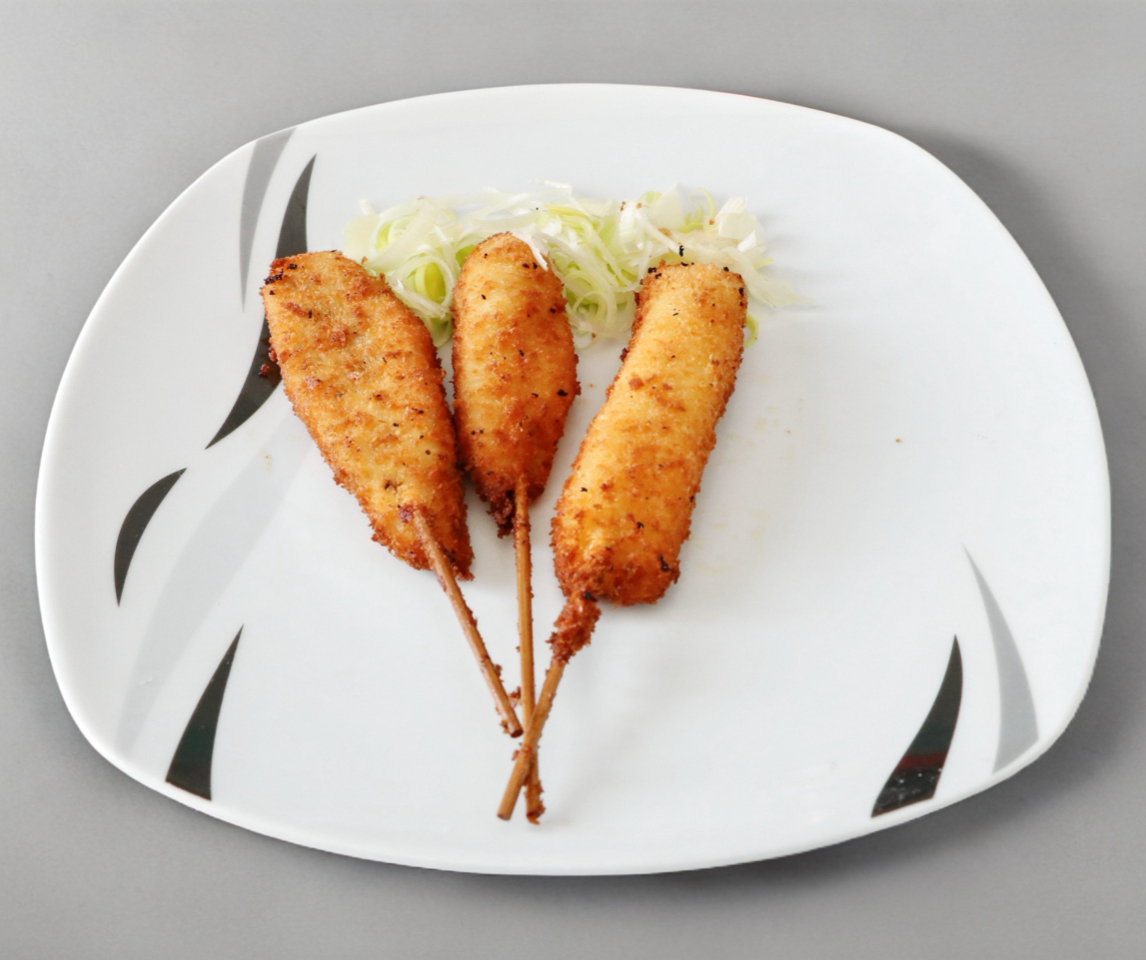 Queso crema, pepino, aguacate, camarón y está forrado con plátano frito y ajonjolí.