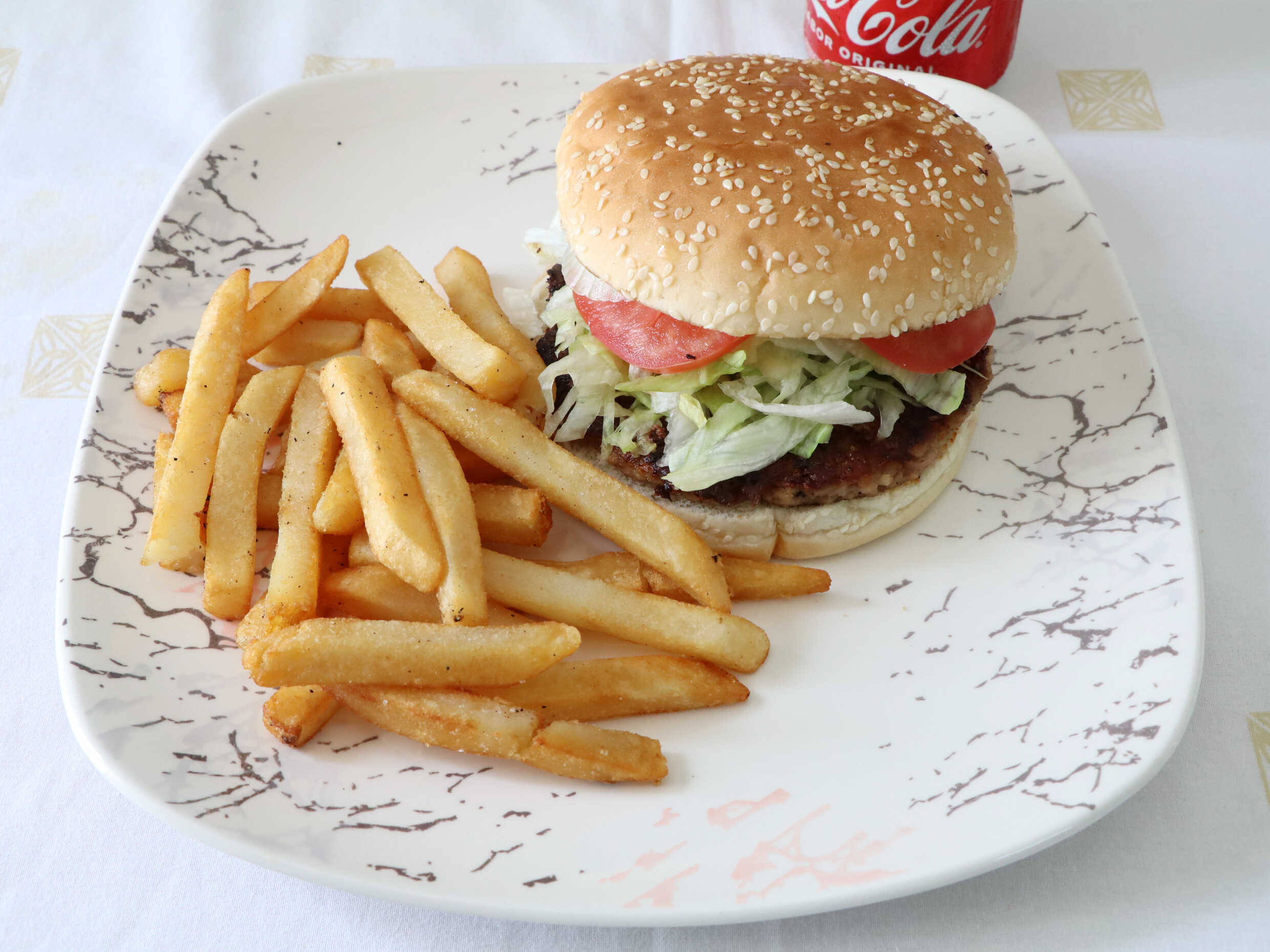 Carne, queso manchego, tomate, cebolla y lechuga. Incluye papas.