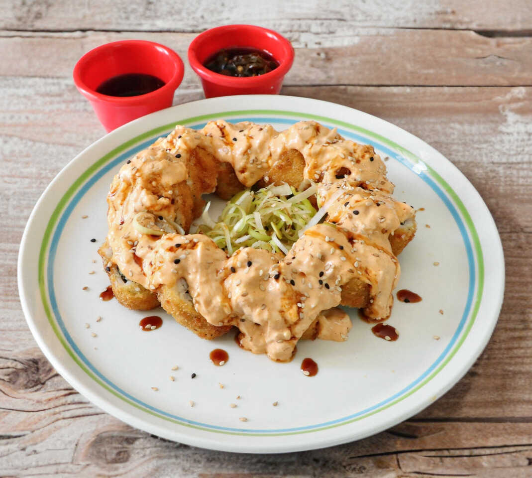 Queso crema, pepino, aguacate carne de res gratinado con BBQ y tocino.
