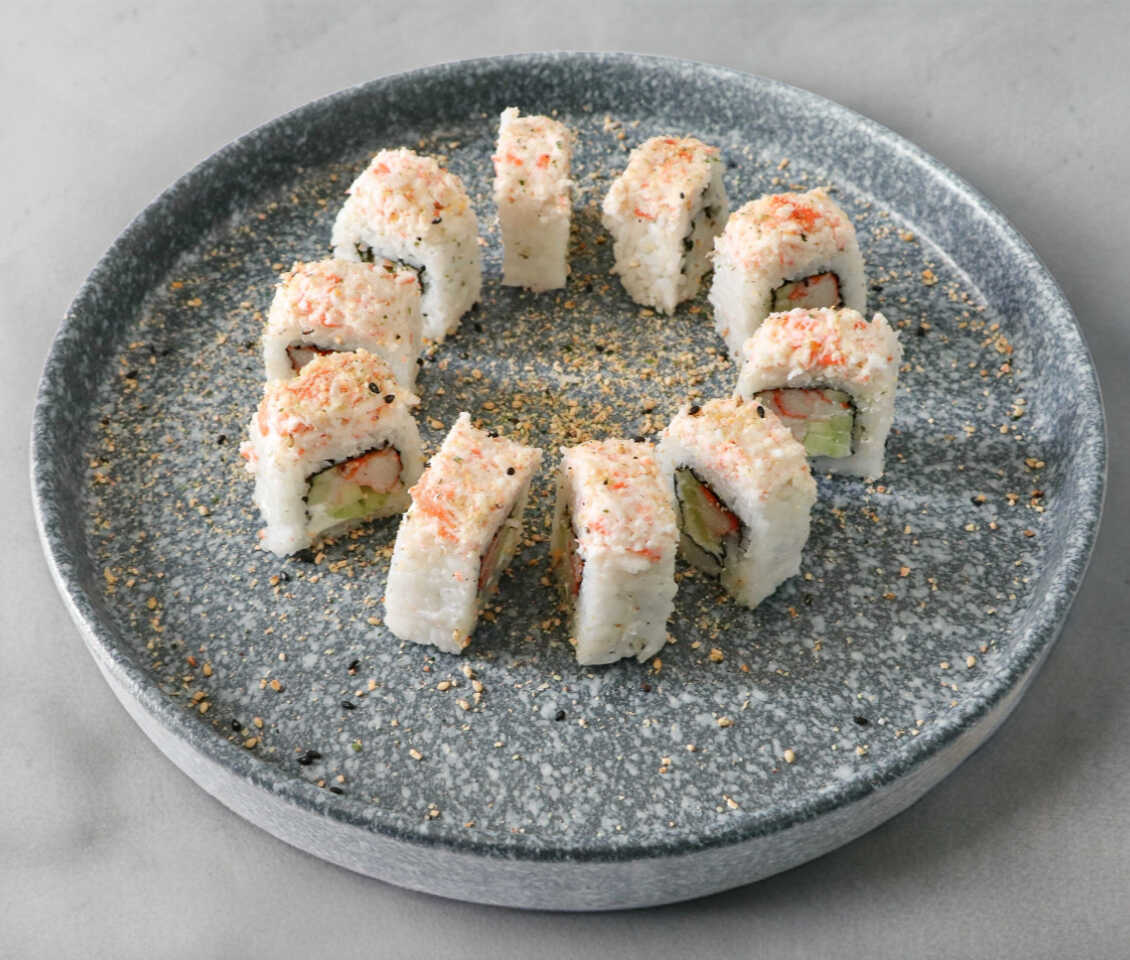 Queso crema, pepino, aguacate, camarón y está forrado con queso crema por fuera con ajonjolí.