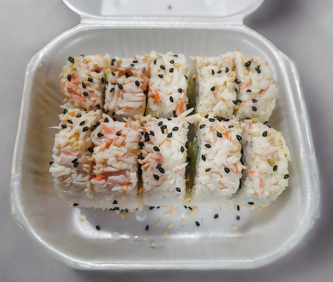 Por dentro camarón, Philadelphia, pepino, aguacate por fuera tampico.