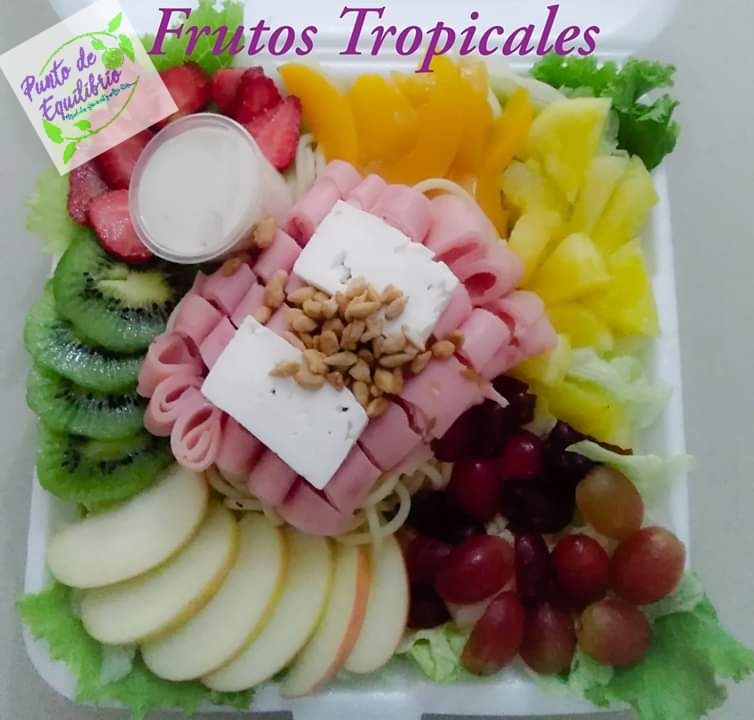Jamón de pavo, manzana, uva, piña, durazno, fresa, kiwi, queso panela, semillas dulces, pasta, lechuga y aderezo. Incluye bebida de cortesía, bebida del día...