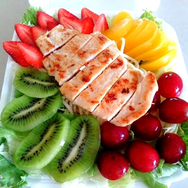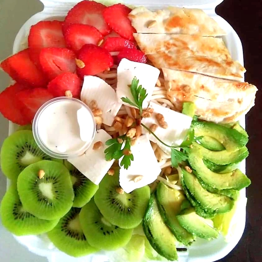 Pechuga a la plancha, piña, manzana, durazno, uva, kiwi, fresa, arándanos, queso panela, pasta, lechuga y aderezo incluye bebida de cortesía, bebida del día sin azúcar...
