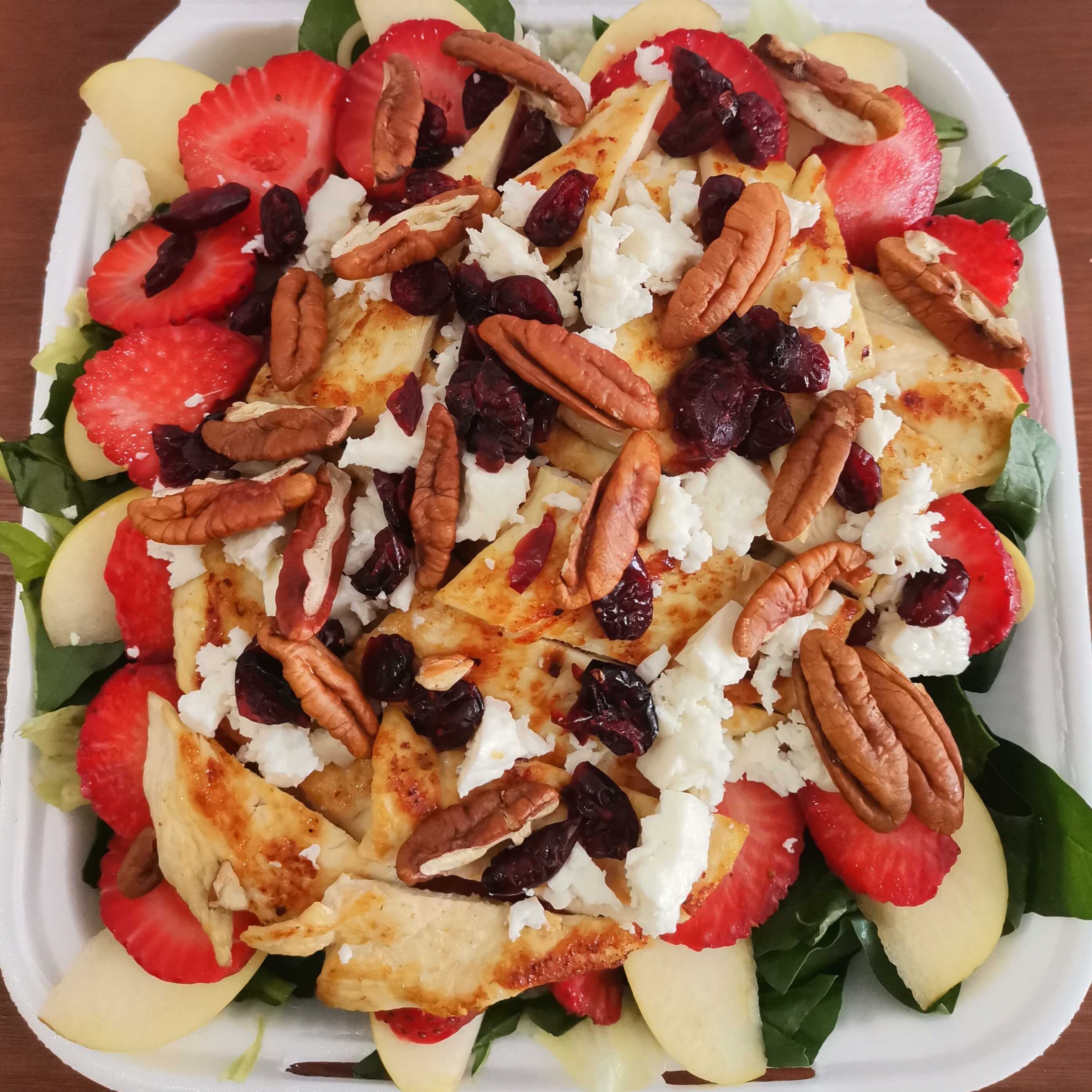 Pechuga a la plancha, fresas, manzana arándanos, queso panela, pasta,cama de lechuga con espinacas y aderezo. Incluye bebida de cortesía sin azúcar...