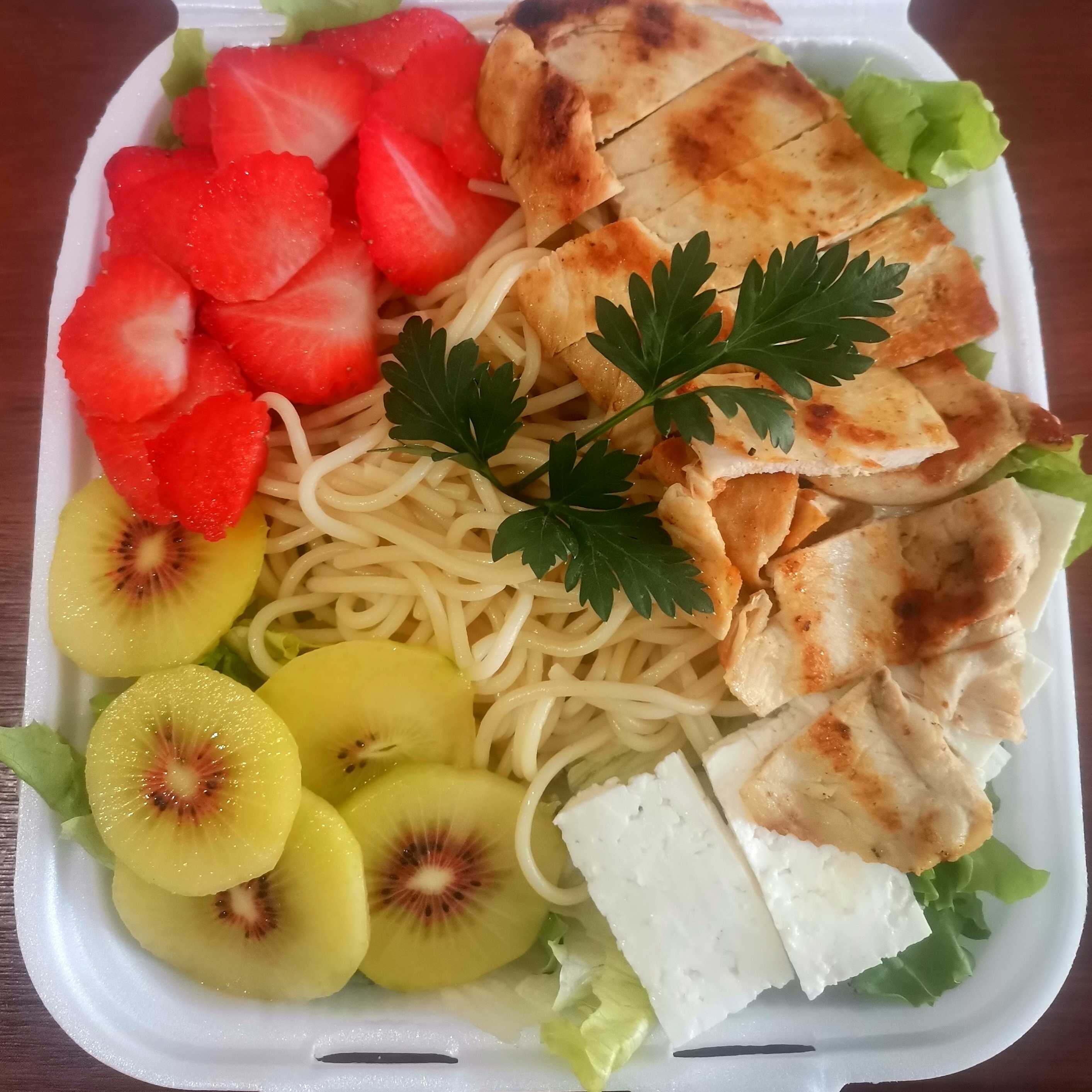 Pechuga a la plancha, kiwi, fresa, queso panela, pasta, lechuga y aderezo. Incluye bebida de cortesía, bebida del día sin azúcar...