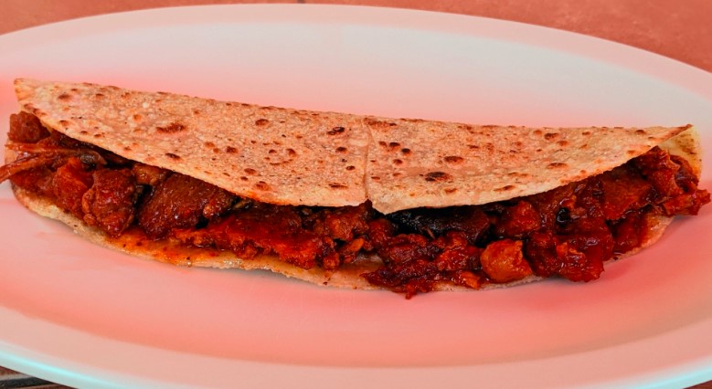 Quesadilla de Harina con chicharrón de cerdo prensado en salsa de chile guajillo