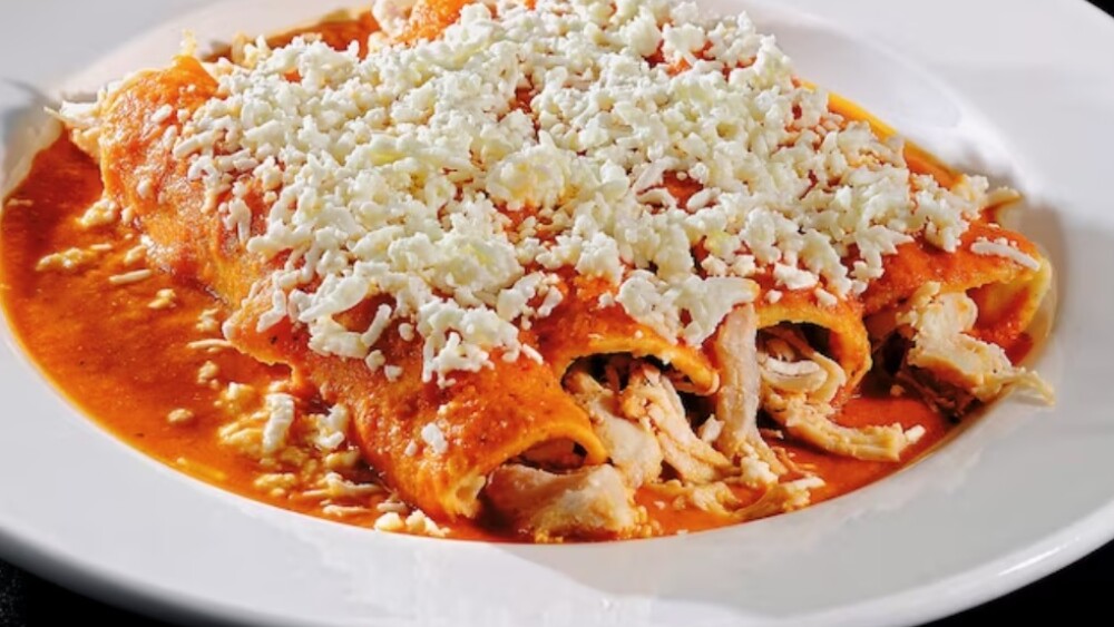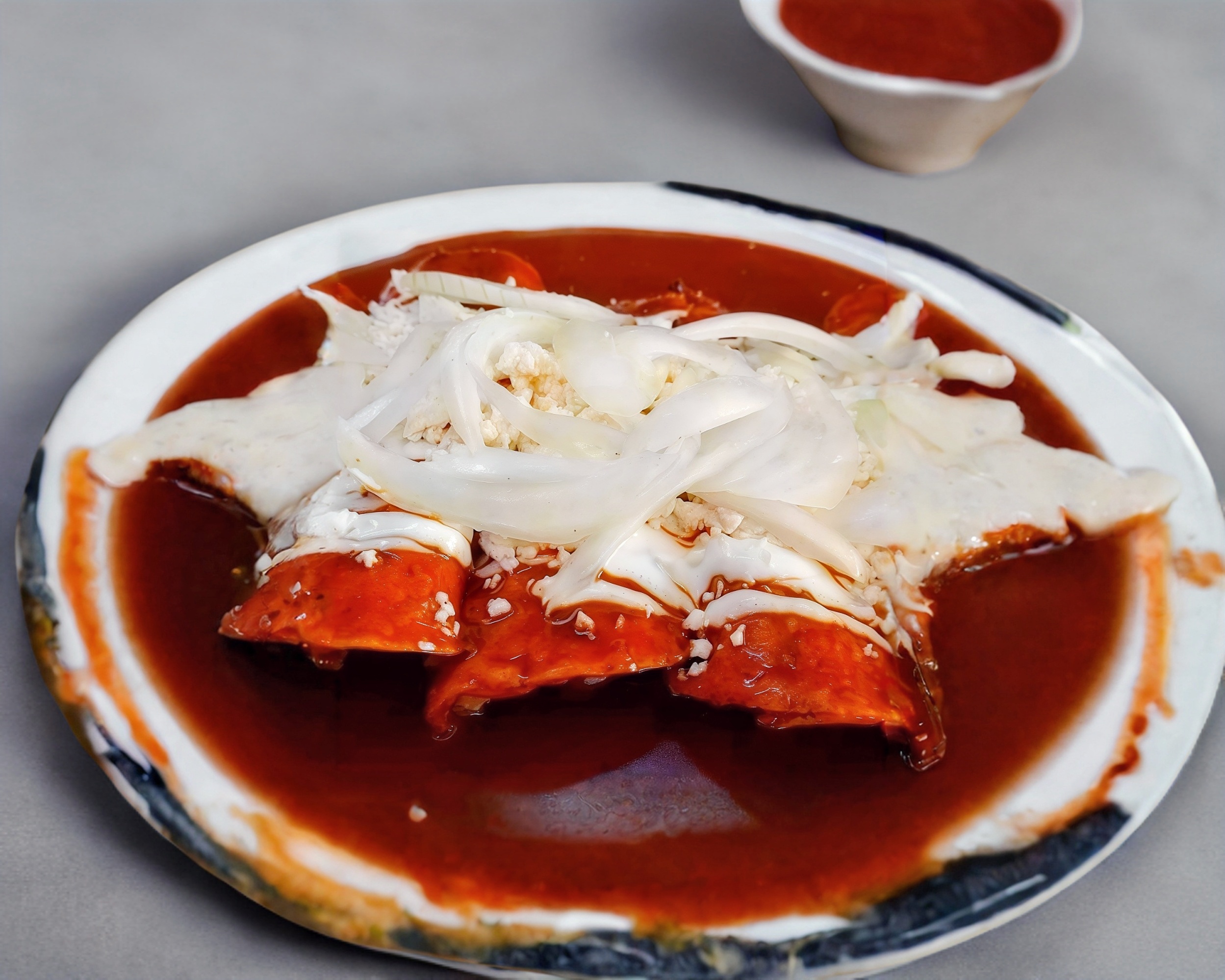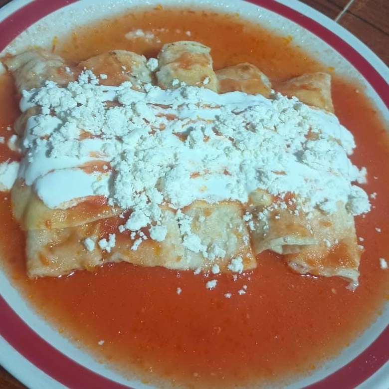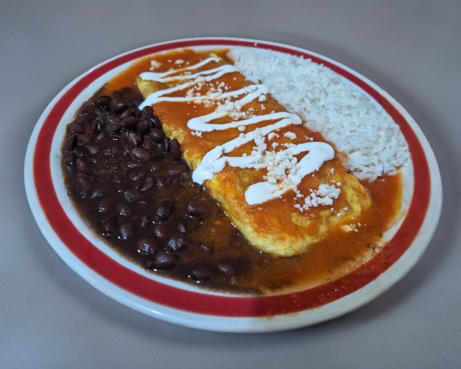 Omelette de huevo relleno de jamón y queso, bañado en salsa roja con crema y queso incluye porción de arroz, frijol y tortilla