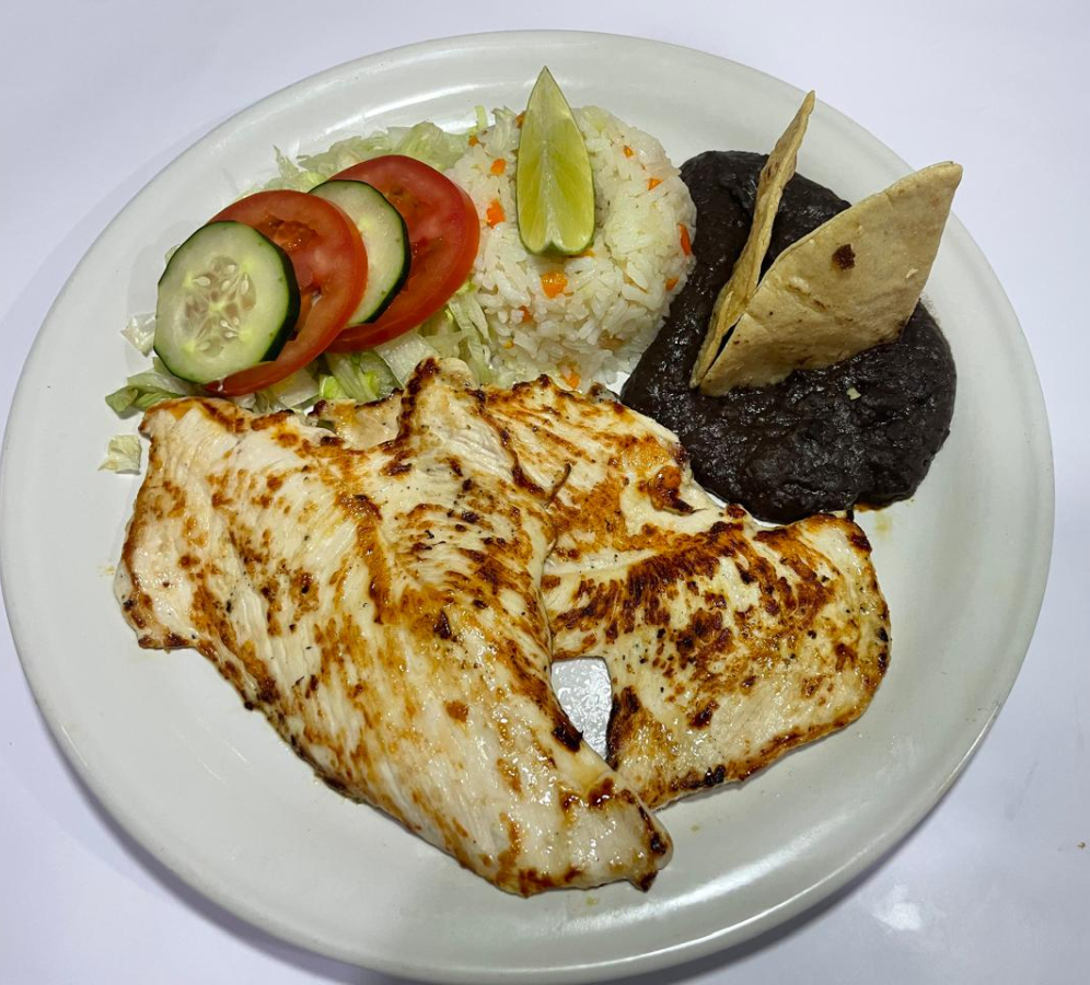 Guarnición: arroz, frijol y ensalada Lechuga, tomate, pepino y una roda de limón