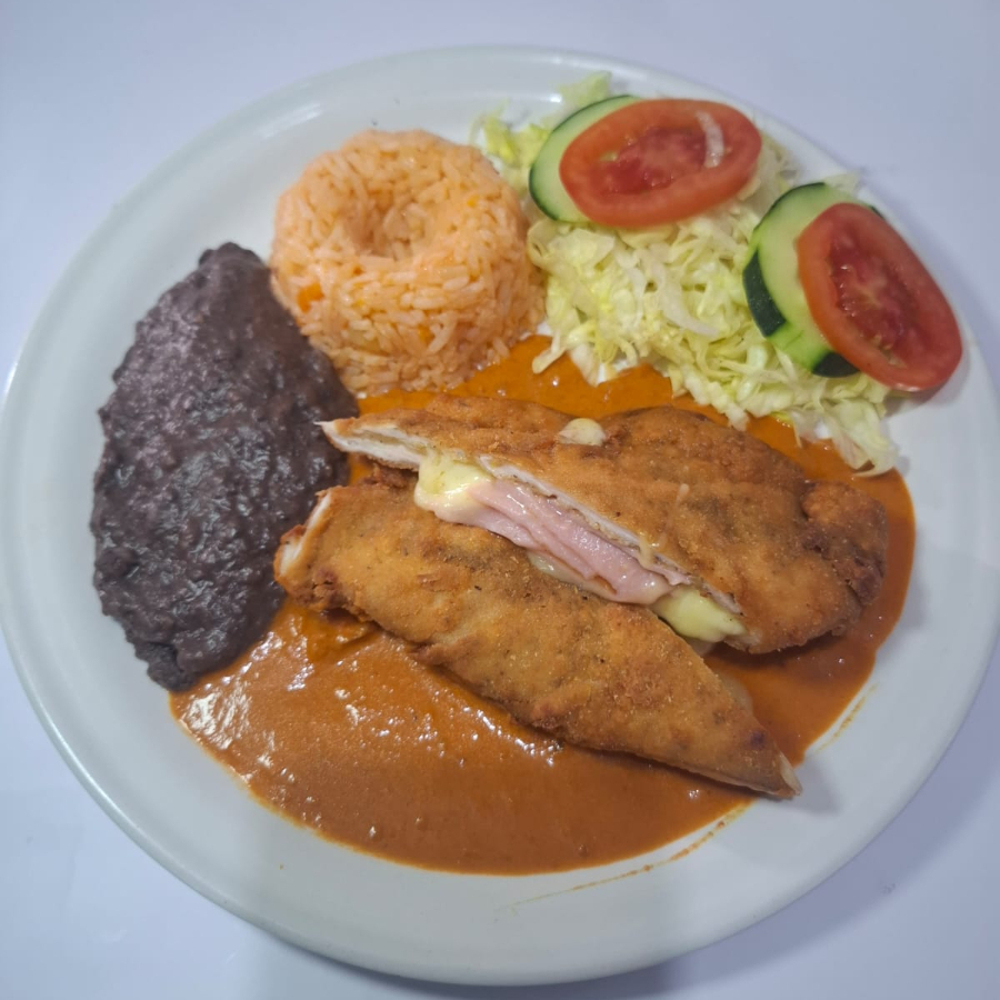 Pechuga rellena de jamón y queso manchego. Guarnición: arroz, frijol y ensalada lechuga, tomate, pepino y una roda de limón.
