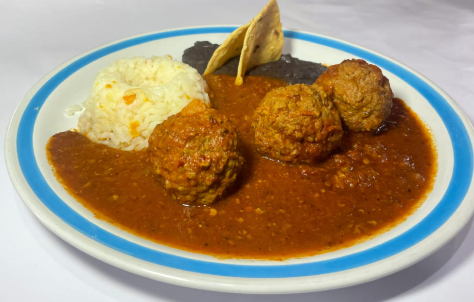 Albóndigas de res en salsa roja. Guarnición de frijol y arroz.