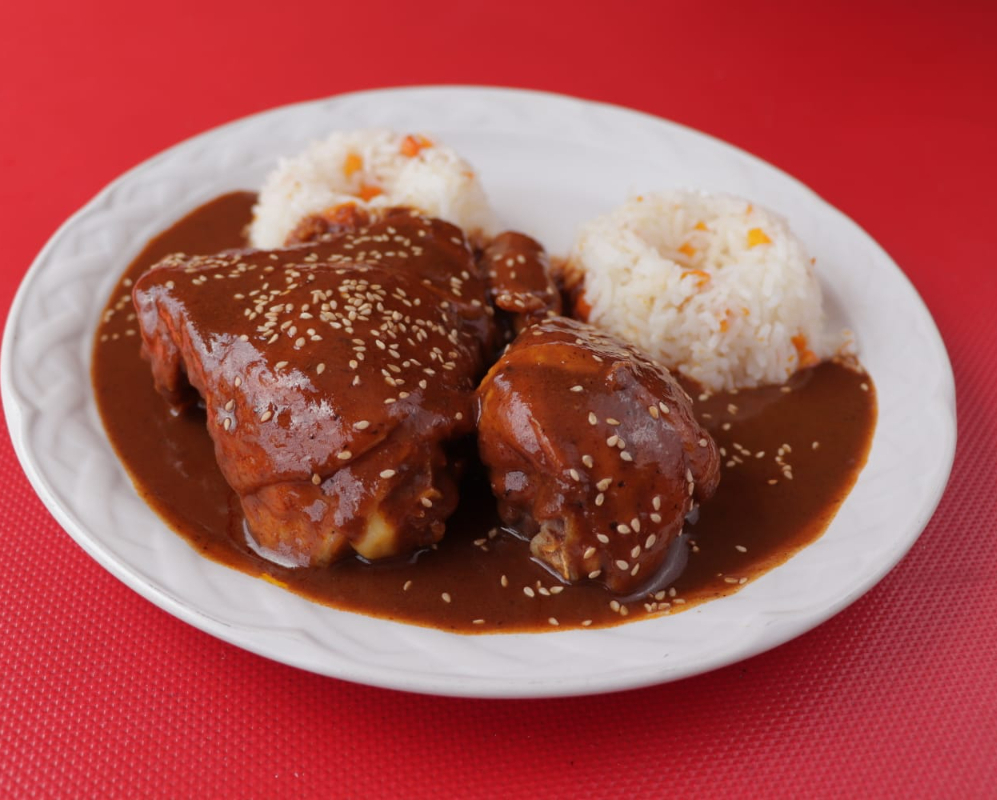 Platillo tradicional mexicano preparado con pollo cocido y bañado en una salsa espesa de mole, elaborada con chiles secos, especias, semillas y, en algunas variantes, chocolate. Su sabor es complejo, balanceado entre lo dulce, lo picante y lo especiado. Acompañado de arroz.
