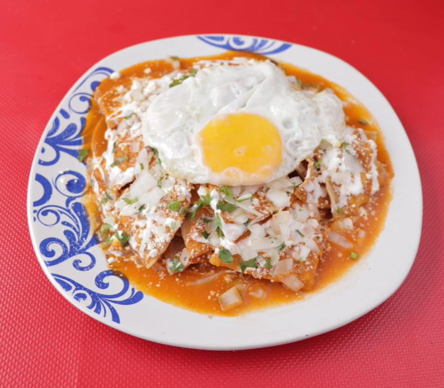 Chilaquiles en salsa roja, salsa verde o mole con pollo o huevos estrellados.