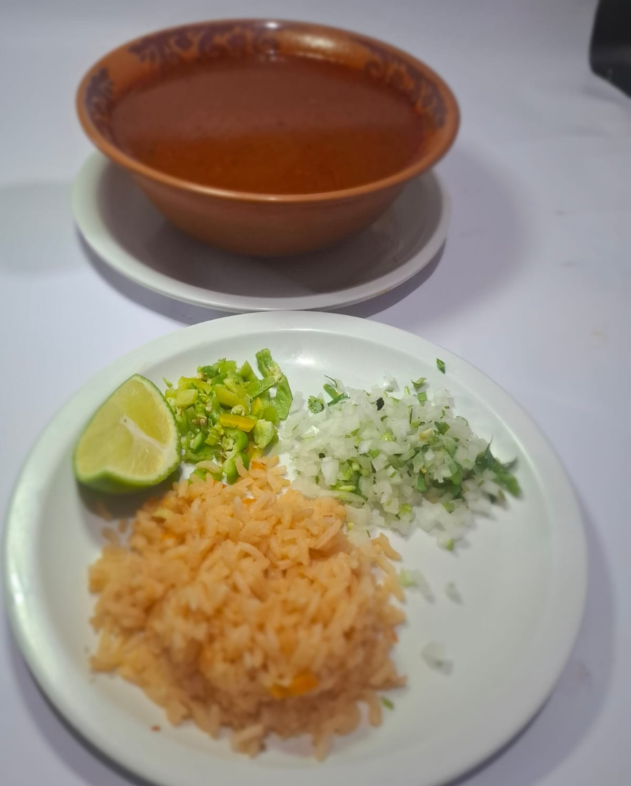 Guarnición de arroz, habanero, limón, cebolla y cilantro.