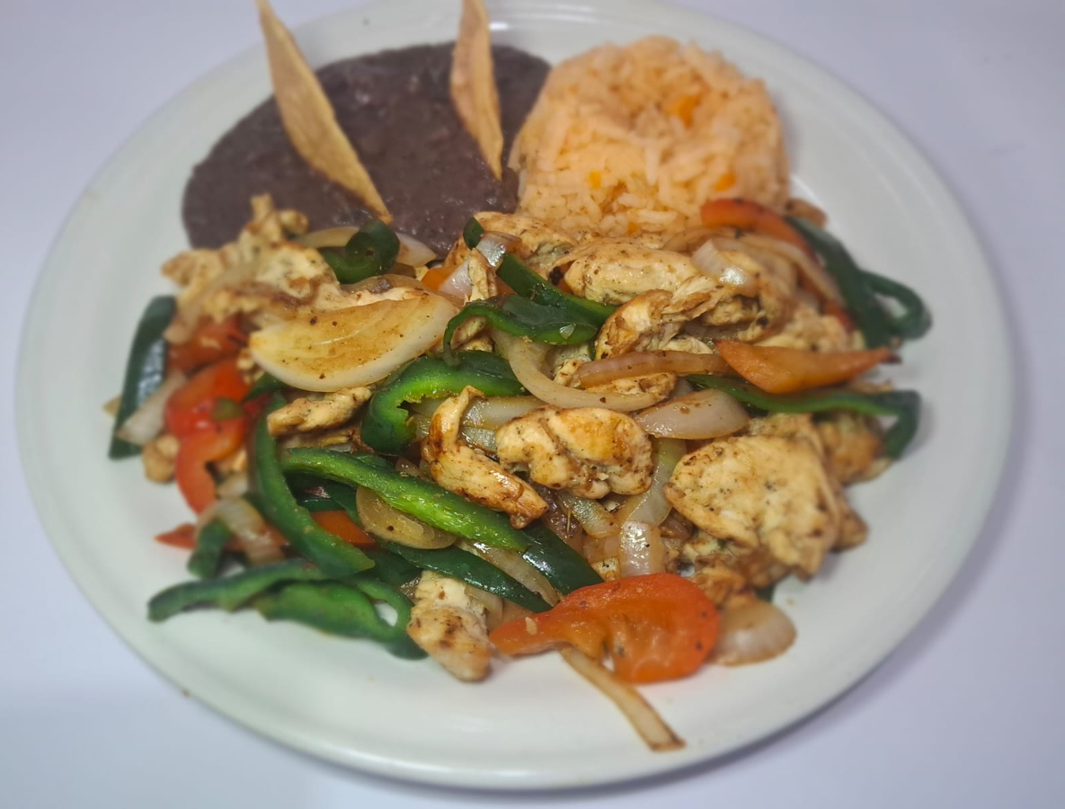 Fajitas de pollo. Guarnición: frijol y arroz.