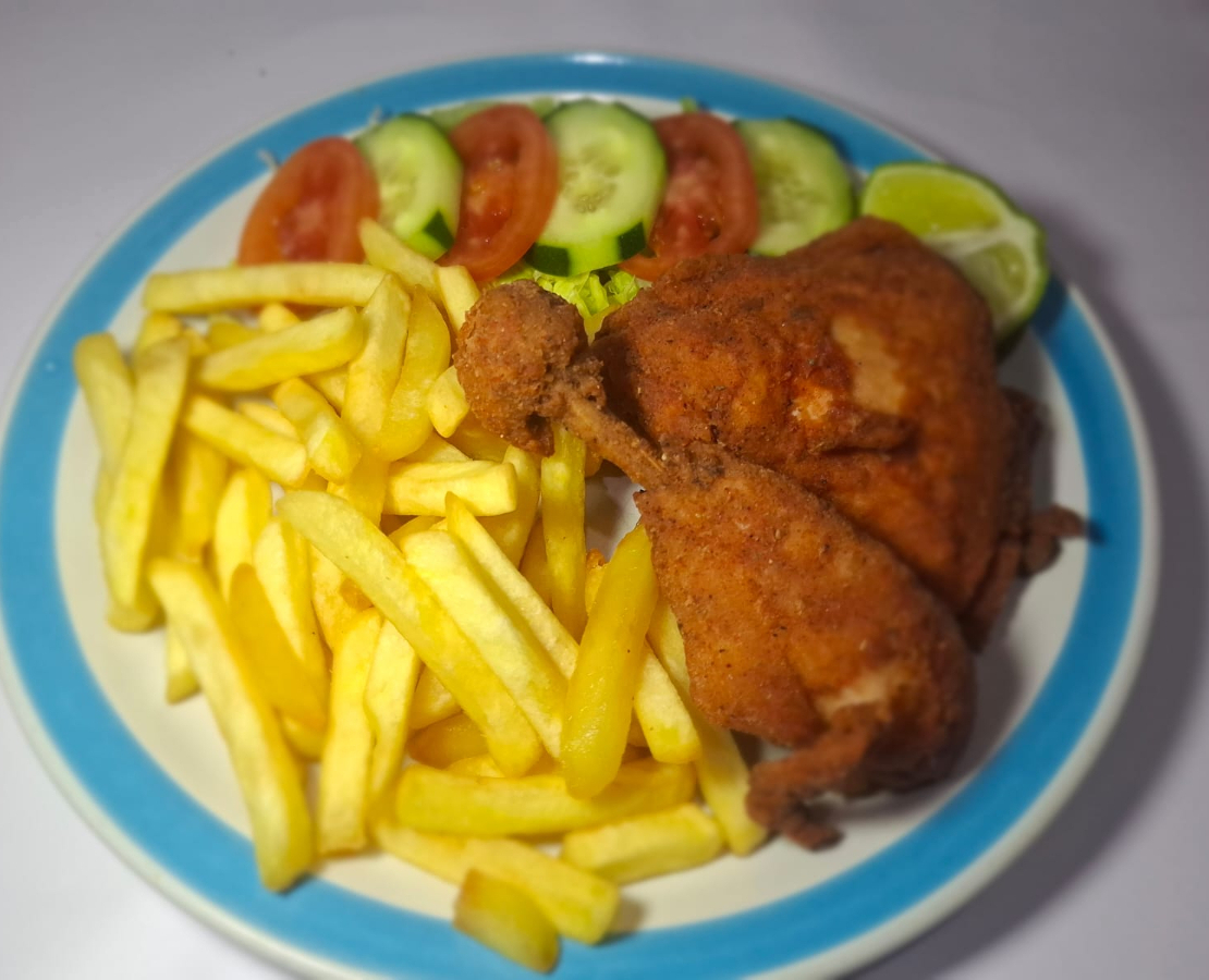 Guarnición: ensalada lechuga, tomate, pepino y una roda de limón. y papas fritas.
