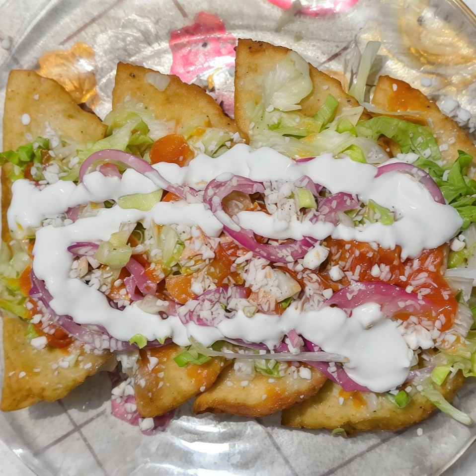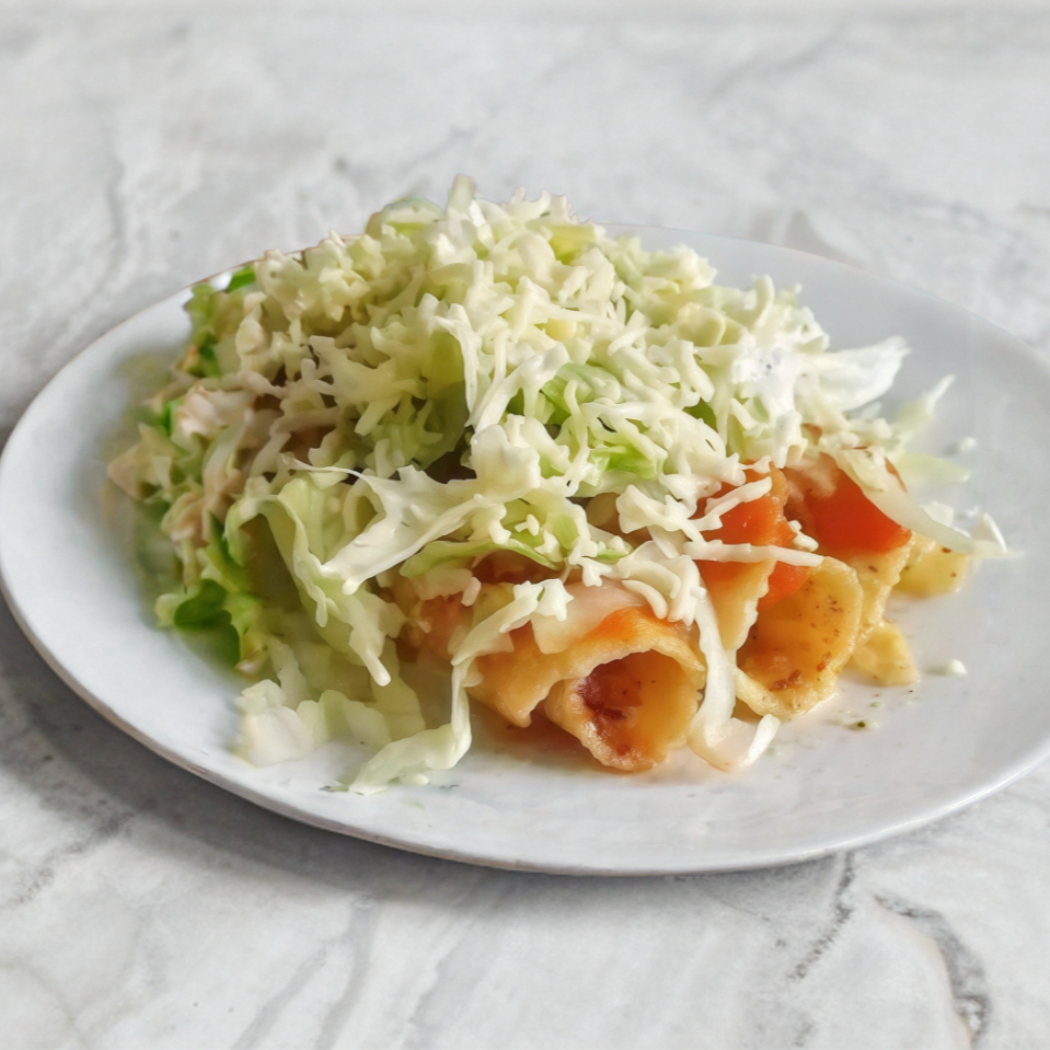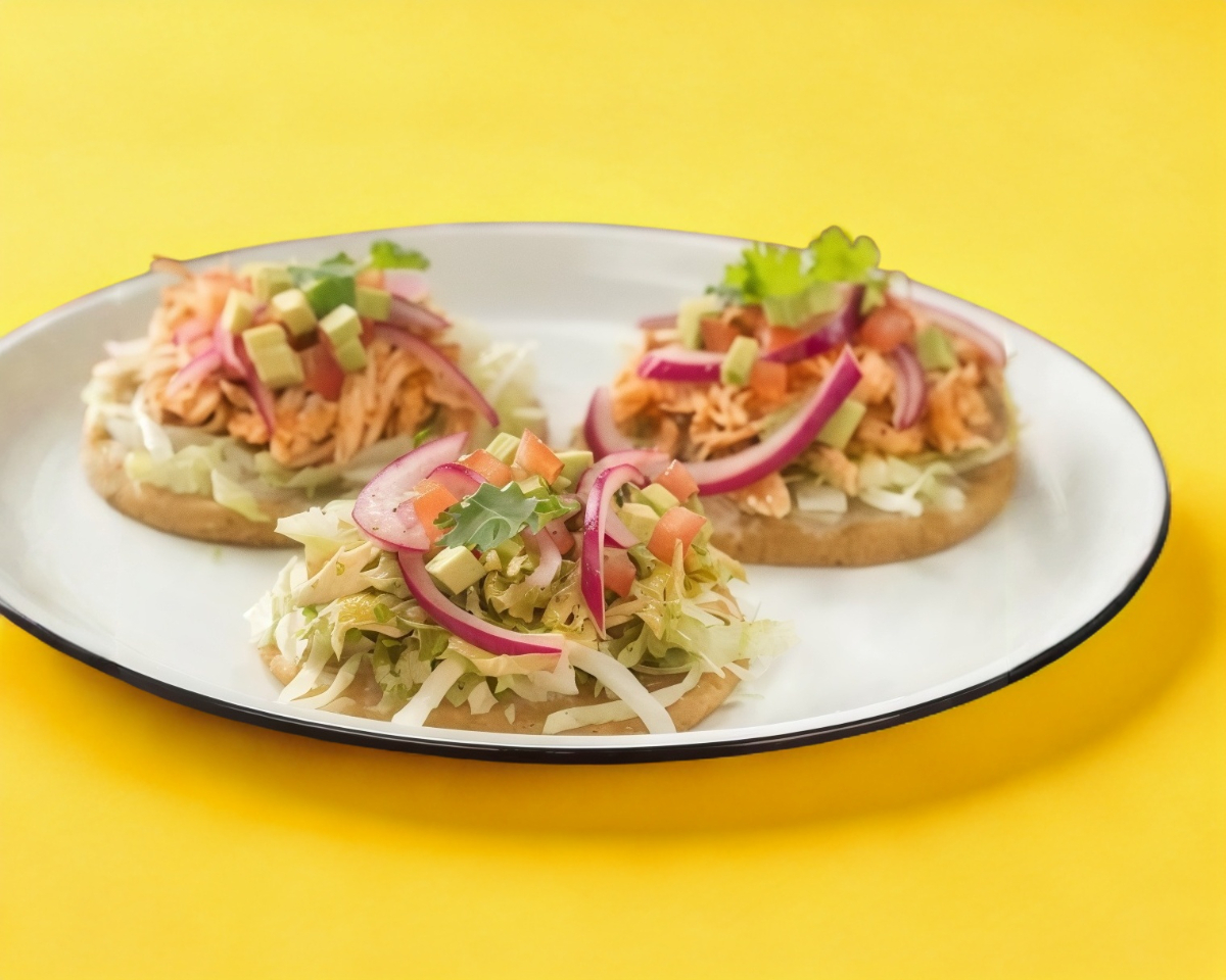 Pollo desmenuzado, lechuga, queso sopero, acompañado de una porción de cebolla, salsa habanera, salsa de tomate y media crema
