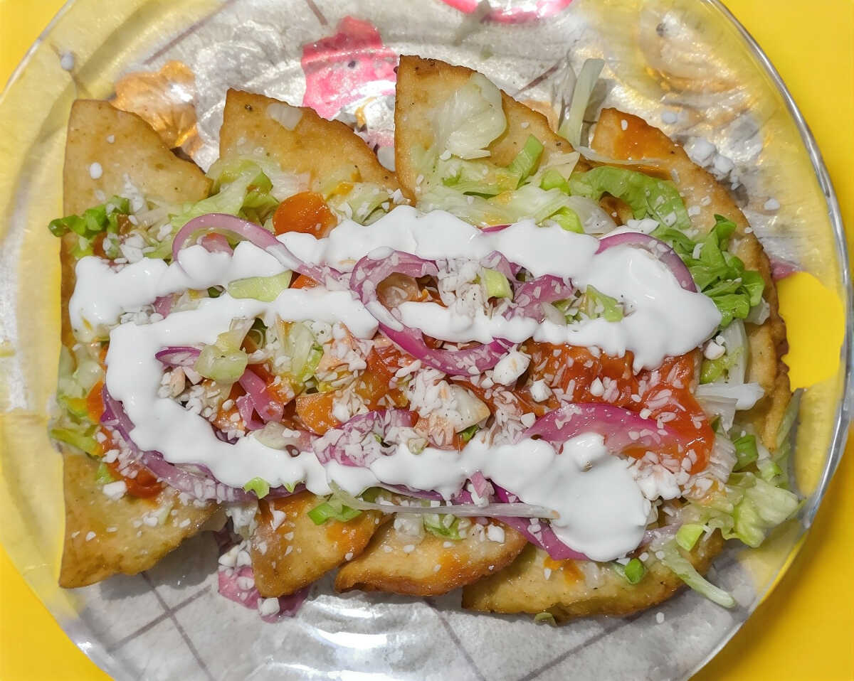 Tortilla de masa con frijol, carne molida, lechuga romana, tomate, queso sopero, media crema y aguacate y salsa habanera