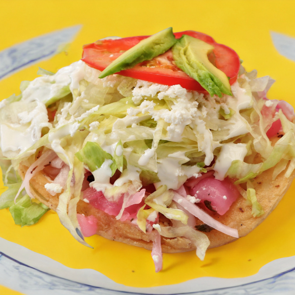 Sope con frijol, crema y queso fresco.