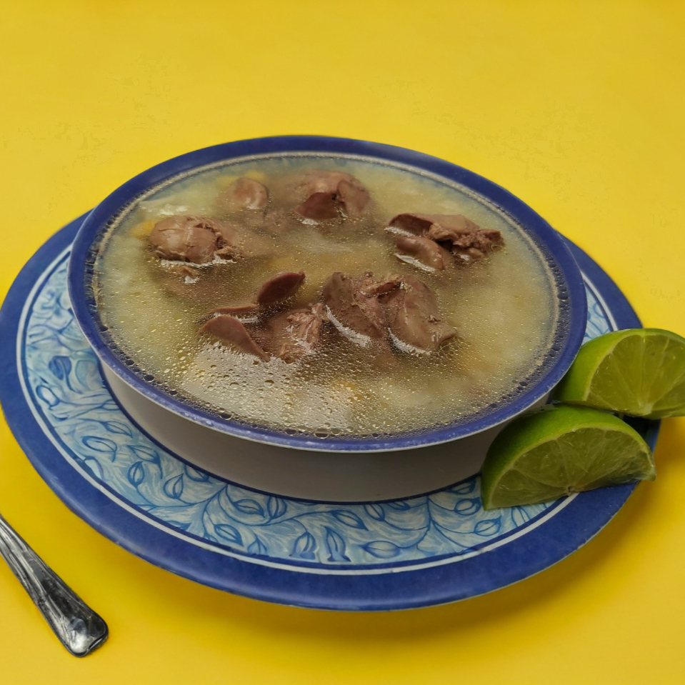 Arroz, garbanzo, hígado, molleja, ala, patita, huacal y pescuezo.Elige entre tortillas a mano, bolillo o tostadas para acompañarlo.