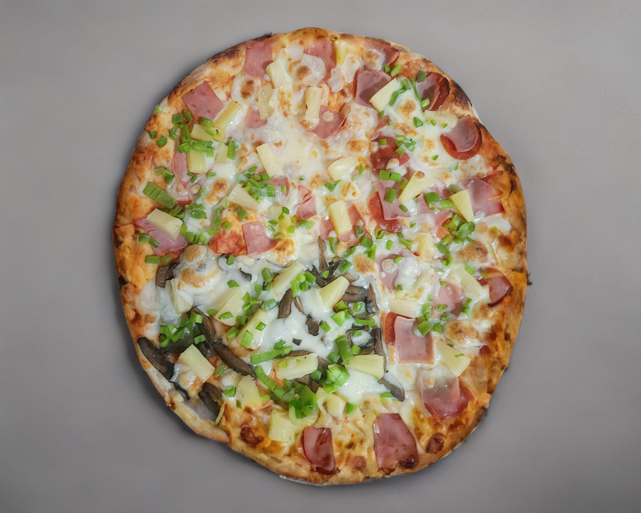 Salsa de pizza, queso chihuahua, piña, cebolla y champiñón.