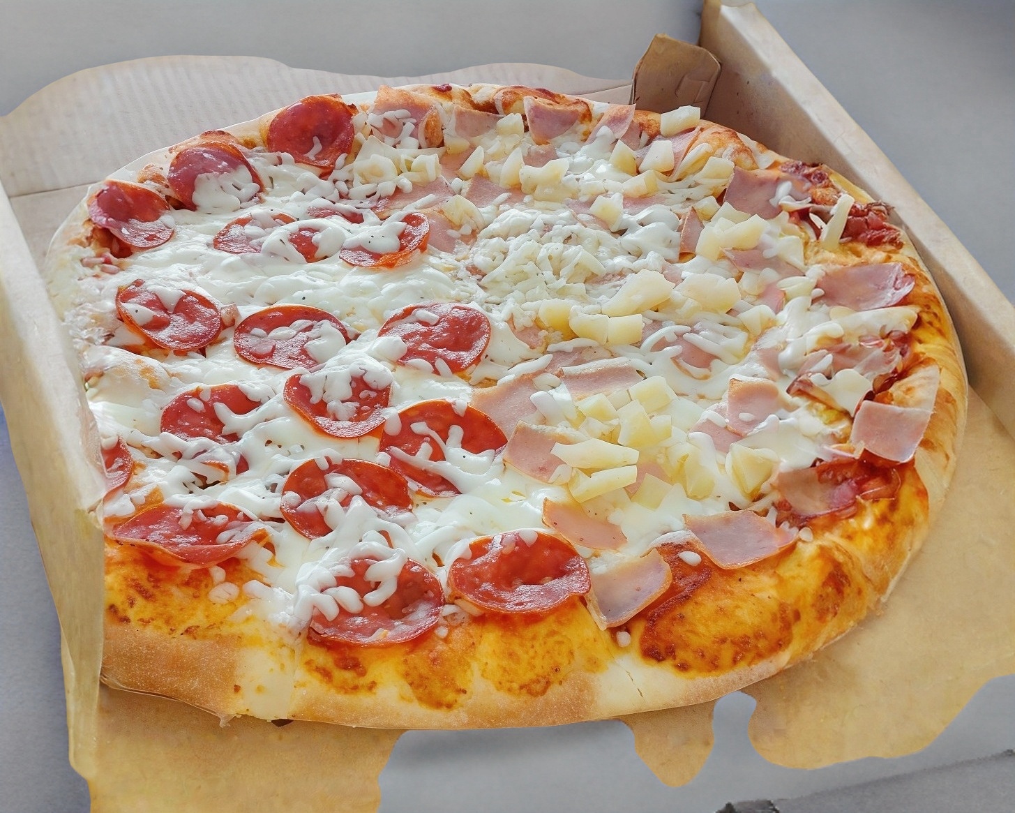 Pizza mitad hawaiana y pepperoni.