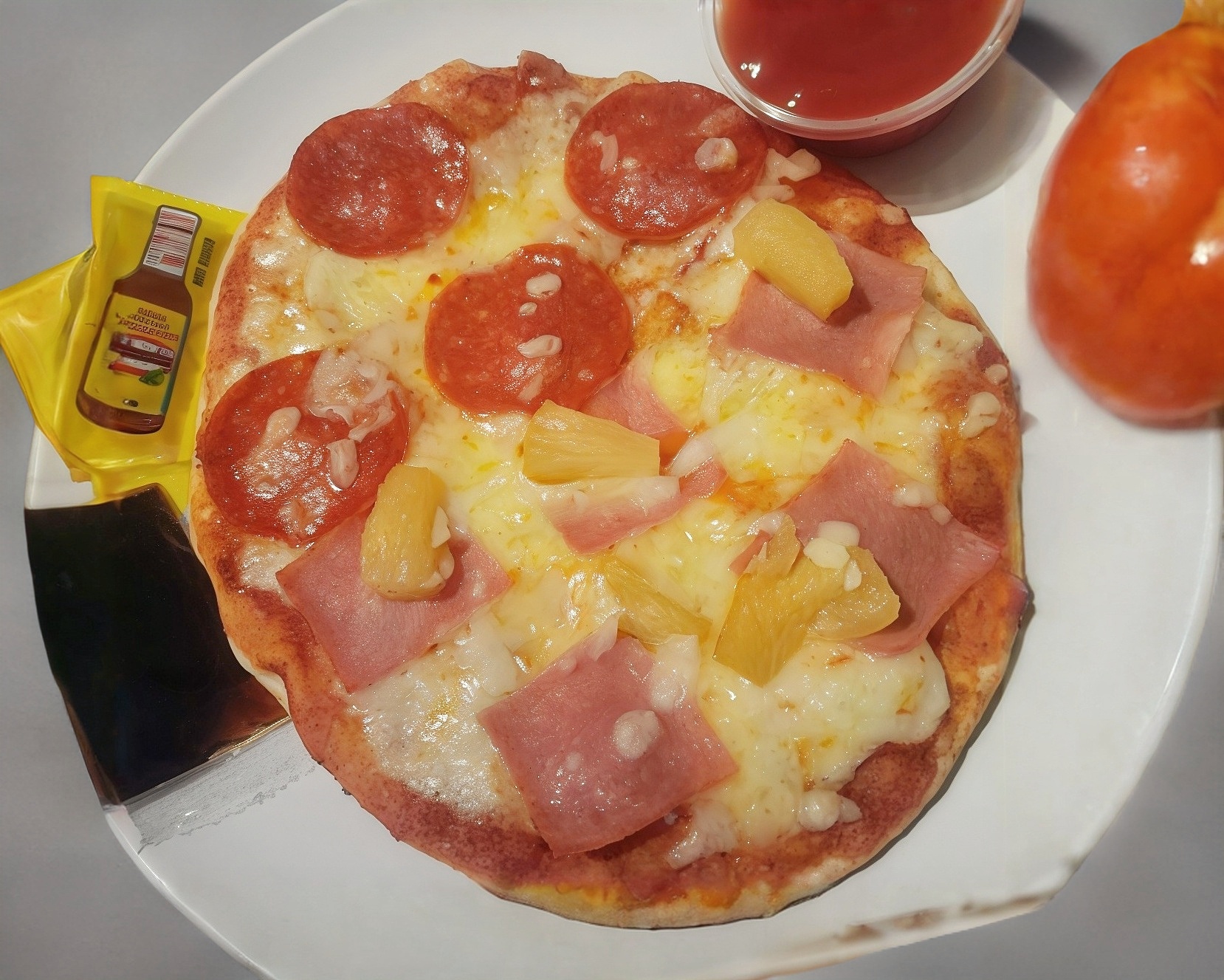 Mitad hawaiana y pepperoni.